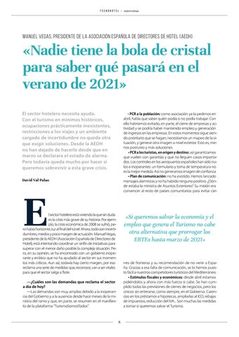 l sector hotelero está viviendo la que sin duda es la crisis más grave de su historia. Por ejemplo, la crisis económica de 2008 se sufrió, pero había horizonte, luz al final del túnel. Ahora, todo son incertidumbres, miedos y poco margen de actuación. Manuel Vegas, presidente de la AEDH (Asociación Española de Directores de Hotel), está intentando coordinar un sinfín de iniciativas para superar con el menor daño posible la compleja situación. Pero, en su opinión, se ha encontrado con un gobierno inoperante y errático que no ha ayudado al sector en sus momentos más críticos. Aun así, todavía hay cierto margen, por eso reclama una serie de medidas que, reconoce, van a ser vitales para que el sector salga a flote.
