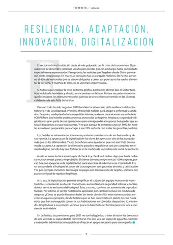 A esto se suma la clara apuesta por el check-in y check-out online, algo que hasta no hace muchos meses parecía improbable. El cliente demanda experiencias 100% seguras, por eso hay que apoyarse en la digitalización para acercarse al máximo a ese 'contacto 0'. Evitar colas y darle al huésped el poder de la autogestión son garantías de éxito y satisfacción. Y si, por ejemplo, incluimos tecnología de pagos con tokenización de tarjetas, el check-out puede ser igual de rápido e higiénico. A su vez, la digitalización permite simplificar el trabajo del equipo humano de nuestro hotel, reduciendo sus tareas monótonas, aumentando la seguridad interna y poniéndolo al servicio exclusivo del huésped. Esto, a su vez, conlleva un aumento de la productividad. Por último, el sector hotelero ha apostado por cambiar incluso los modelos de negocio. ¿Cómo se puede llenar un hotel sin tener clientes? En este número podrás encontrar algunos ejemplos, desde hoteles que se han convertido en platós de cine hasta otros que han conseguido convertir sus habitaciones en cómodos despachos. Y, ante todo, dirigiéndose a sus propios vecinos, pues no hace falta ser turista para vivir una experiencia inolvidable. En definitiva, las previsiones para 2021 no son halagüeñas, si bien el sector ha demostrado una vez más su capacidad de reinventarse. Por eso, va a ser capaz de aguantar, siempre y cuando las administraciones públicas ofrezcan el apoyo necesario para conseguirlo. n