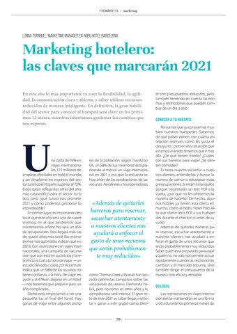 Marketing hotelero: las claves que marcarán 2021 En este año lo más importante va a ser la flexibilidad, la agilidad, la comunicación clara y abierta, y saber utilizar recursos reducidos de manera inteligente. En definitiva, la gran habilidad del sector para conocer al huésped será clave en los próximos 12 meses, mientras intentamos gestionar los cambios que nos esperan.