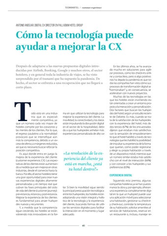 odo esto en una industria que es especialmente competitiva, ya que un número cada vez mayor de hoteles compite por los corazones y las mentes de los clientes. Por lo que, el regreso paulatino a la normalidad provocará que se intensifique aún más la competencia, debido a un exceso de oferta y a márgenes reducidos, así que es necesario buscar reforzar la posición competitiva. Es aquí donde entra en juego la mejora de la experiencia del cliente (customer experience, CX). Las expectativas de los clientes están aumentando a medida que ven mejoras en otras industrias, desde el comercio hasta la banca. Por ello, el sector hotelero tiene una gran oportunidad para crear nuevas experiencias digitales altamente personalizadas y en tiempo real que cubran las fases principales del ciclo de vida del cliente (customer journey): pre-estancia, estancia y post-estancia. Mejorar la experiencia de los clientes es fundamental para atraer huéspedes nuevos y recurrentes. Y, a medida que la competencia sigue creciendo, los hoteles se están volviendo más innovadores en la for-