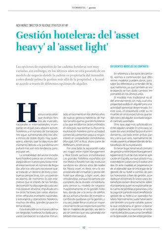 lado, el nacimiento en los últimos años de nuevas gestoras hoteleras, de menor tamaño que las grandes hoteleras a las que estábamos acostumbrados en este país, que centran su foco en la explotación hotelera como actividad comercial y presentan poco o ningún interés en propiedades inmobiliarias (Marugal, GAT o Alua, ahora parte de AMResorts, entre otros). Por otro lado, la separación cada vez mayor entre Hotel Management y Real Estate (activos inmobiliarios). Las grandes hoteleras españolas como Meliá o Barceló han ido evolucionando en los últimos años de modelos 'heavy asset', es decir, ser a la vez propietario del inmueble y gestor del hotel que alberga, a light asset, desvinculándose, aunque no siempre por completo, de la división inmobiliaria para centrar su modelo de negocio mayoritariamente en la gestión hotelera, dando pie a la venta de ciertos de sus activos a fondos de inversión a cambio de quedarse con la gestión, y a su vez, poder llevar a cabo un mayor crecimiento de sus respectivos portfolios en modelos de gestión, sea del tipo de contrato que sea, ganando visibilidad internacional.