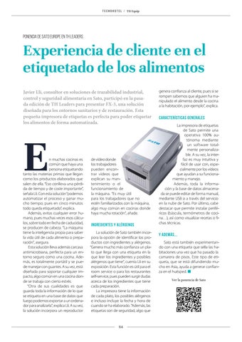 INGREDIENTES Y ALÉRGENOS La solución de Sato también incorpora la opción de identificar los productos con ingredientes y alérgenos. “Genera mucho más confianza un plato que llega con una etiqueta en la que leer los ingredientes y posibles alérgenos que tiene”, cuenta Lli en su exposición. Esta función es útil para el room service o para los restaurantes self-service, pues pueden surgir dudas acerca de los ingredientes que tiene cada preparación. La impresora tiene la información de cada plato, los posibles alérgenos e incluso incluye la fecha y hora de cuando se ha elaborado. “Además, las etiquetas son de seguridad, algo que