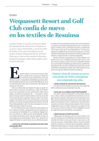 stados Unidos ve una luz en el oscuro túnel de la pandemia de coronavirus. Desde hace semanas, el país experimenta una notable disminución en casi todos los indicadores que dan cuenta de la favorable evolución. Con más de 200 millones de vacunas administradas hasta abril, la reactivación del turismo está cada vez más cerca. Existe una demanda acumulada de viajes; la gente necesita volver a conectar, vivir, disfrutar y viajar. En el último año se han pospuesto muchas experiencias vitales como bodas, vacaciones, aniversarios, etc… y no existe un reemplazo virtual para ellas. Estados Unidos una de las zonas del mundo donde están surgiendo “brotes verdes”. Uno de los lugares más bonitos de la costa este del país es Cape Cod, donde se encuentra el lujoso Wequassett Resort and Golf Club, distinguiéndose como el único complejo de cinco estrellas de la guía Forbes en la zona. Sus 120 habitaciones, están repartidas entre amplias suites y cabañas privadas, consiguiendo que el huésped viva una experiencia inolvidable. En un ambiente relajado frente al mar, ofrece un cálido servicio personalizado. Vestido con textiles de Resuinsa de la más alta calidad, el lujo y la comodidad están garantizados. Alton Chun, general manager del hotel, nos cuenta cómo se vive allí esta situación.