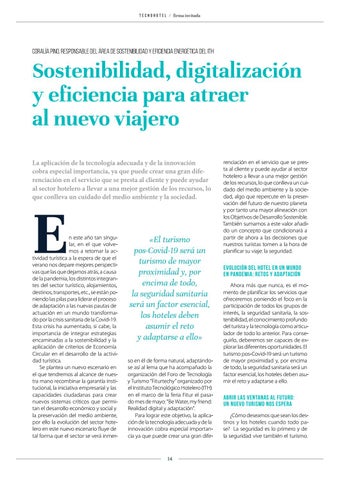 n este año tan singular, en el que volvemos a retomar la actividad turística a la espera de que el verano nos depare mejores perspectivas que las que dejamos atrás, a causa de la pandemia, los distintos integrantes del sector turístico, alojamientos, destinos, transportes, etc., se están poniendo las pilas para liderar el proceso de adaptación a las nuevas pautas de actuación en un mundo transformado por la crisis sanitaria de la Covid-19. Esta crisis ha aumentado, si cabe, la importancia de integrar estrategias encaminadas a la sostenibilidad y la aplicación de criterios de Economía Circular en el desarrollo de la actividad turística. Se plantea un nuevo escenario en el que tendremos al alcance de nuestra mano recombinar la garantía institucional, la iniciativa empresarial y las capacidades ciudadanas para crear nuevos sistemas críticos que permitan el desarrollo económico y social y la preservación del medio ambiente, por ello la evolución del sector hotelero en este nuevo escenario fluye de tal forma que el sector se verá inmer-