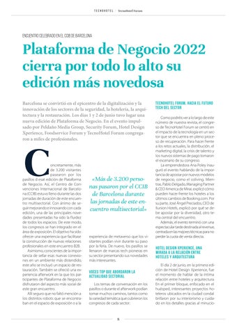 TecnoHotel Forum, hacia el futuro tech del sector Como podréis ver a lo largo de este número de nuestra revista, el congreso de TecnoHotel Forum se centró en el impacto de la tecnología en un sector que se encuentra en pleno proceso de recuperación. Para hacer frente a los retos actuales, la distribución, el marketing digital, la crisis de talento y los nuevos sistemas de pago tomaron el escenario de su congreso. La emprendedora Ana Poley inauguró el evento hablando de la importancia de apostar por nuevos modelos de negocio, como el coliving. Mientras, Pablo Delgado, Managing Partner & CEO America de Mirai, explicó cómo pueden hacer frente los hoteles a los últimos cambios de Booking.com. Por su parte, José Ángel Preciados, CEO de Ilunion Hotels, explicó por qué se debe apostar por la diversidad, otro tema central del encuentro. Además, el evento terminó con una espectacular tarde destinada al revenue, centrada en las mejores técnicas para no perder la cuota de venta directa.
