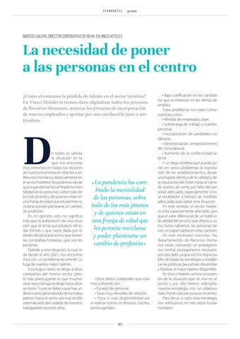 La necesidad de poner a las personas en el centro ¿Cómo afrontamos la pérdida de talento en el sector turístico? En Vincci Hoteles lo tienen claro: digitalizar todos los procesos de Recursos Humanos, mejorar los procesos de incorporación de nuevos empleados y apostar por una retribución justa y motivadora.