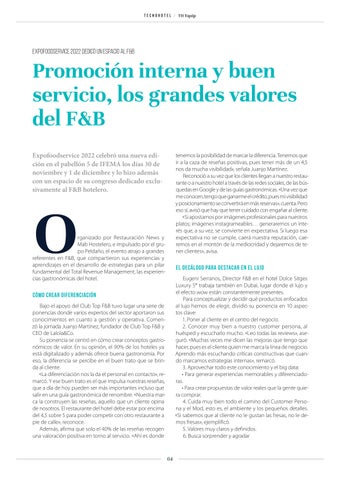 El decálogo para destacar en el lujo Eugeni Serranos, Director F&B en el hotel Dolce Sitges Luxury 5* trabaja también en Dubai, lugar donde el lujo y el efecto wow están constantemente presentes. Para conceptualizar y decidir qué productos enfocados al lujo hemos de elegir, dividió su ponencia en 10 aspectos clave: 1. Poner al cliente en el centro del negocio. 2. Conocer muy bien a nuestro customer persona, al huésped y escucharlo mucho. «Leo todas las reviews», aseguró. «Muchas veces me dicen las mejoras que tengo que hacer, pues es el cliente quien me marca la línea de negocio. Aprendo más escuchando críticas constructivas que cuando marcamos estrategias internas», remarcó. 3. Aprovechar todo este conocimiento y el big data: • Para generar experiencias memorables y diferenciadoras. • Para crear propuestas de valor reales que la gente quiera comprar. 4. Cuida muy bien todo el camino del Customer Persona y el Mod, esto es, el ambiente y los pequeños detalles. «Si sabemos que al cliente no le gustan las fresas, no le demos fresas», ejemplificó. 5. Valores muy claros y definidos. 6. Busca sorprender y agradar