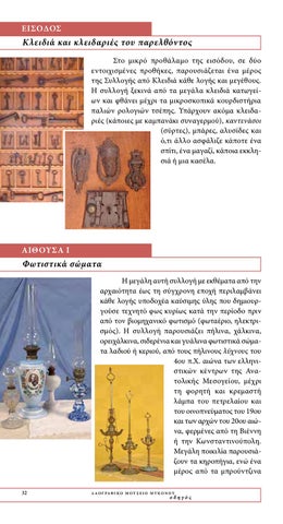 Κλειδιά και κλειδαριές του παρελθόντος Στο μικρό προθάλαμο της εισόδου, σε δύο εντοιχισμένες προθήκες, παρουσιάζεται ένα μέρος της Συλλογής από Κλειδιά κάθε λογής και μεγέθους. Η συλλογή ξεκινά από τα μεγάλα κλειδιά κατωγείων και φθάνει μέχρι τα μικροσκοπικά κουρδιστήρια παλιών ρολογιών τσέπης. Υπάρχουν ακόμα κλειδαριές (κάποιες με καμπανάκι συναγερμού), καντενάσοι (σύρτες), μπάρες, αλυσίδες και ό,τι άλλο ασφάλιζε κάποτε ένα σπίτι, ένα μαγαζί, κάποια εκκλησιά ή μια κασέλα.