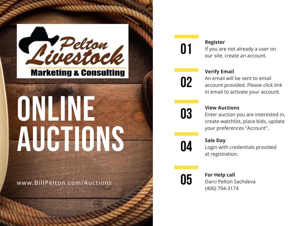 To register, select the Login/Register link on the right top side of the screen in the navigation bar. Register for a new account by entering your contact information, email address, desired password, etc. Once you submit the auction registration form, an email will be sent to the email account provided. Please click the link in that email to activate your account. Please keep your user infomration (email address and passoword) in a secure place as you can use the same account login for all onine auctions hosted by Pelton Livestock. If you have any questions or need assistance with creating an account or bidding, please call PELTON LIVESTOCK Darci Sachdeva at 406-794-3174.