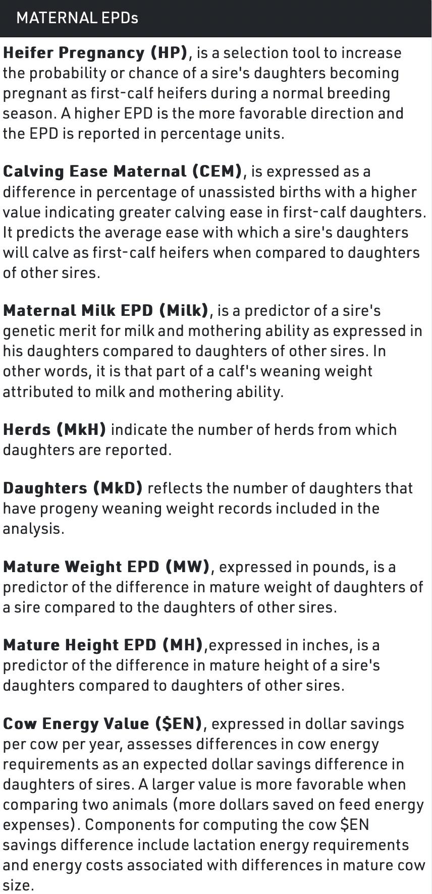 TAG #131 #20205221 03/06/2021 CED BW WW YW SC HP -1 3.2 64 121 .21 14.0 EPDS MILK $EN DOC RE $W $C 17 -23 26 .69 43 219 1 BRED TO: G A Pappy 132 or GA Storm 016 DUE/4/10 sire: S A V Resource 1441 dam: G A Ebony 556 TAG #129 #20282220 3/05/2021 CED BW WW YW SC HP 0 3.6 78 136 .09 16.3 EPDS MILK $EN DOC RE $W $C 28 -29 17 1.05 69 300 2 BRED TO: G A Pappy 132 or GA Storm 016 Due/3/15 Sire: Jindra Blackout Dam: G A Colossal Anne 702 TAG #123 #20205234 03/04/2021 CED BW WW YW SC HP 6 .1 61 106 .18 12.7 EPDS MILK $EN DOC RE $W $C 28 -5 7 .49 66 244 3 BRED TO:G A STORM 016 DUE/3/10 sire: Baldridge Pappy dam: G A Ebony 746 2021 Registered Dam of lot 1