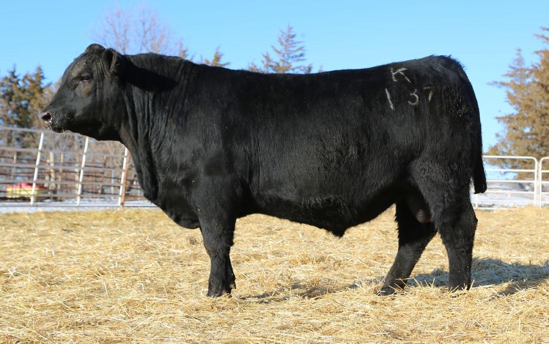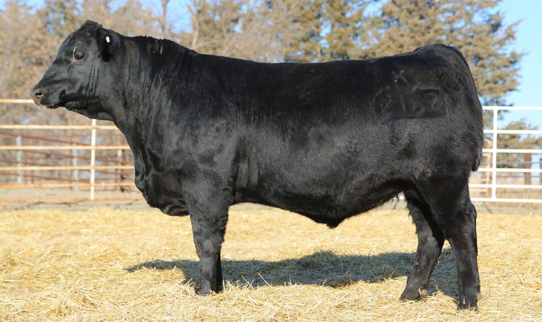 A bull that has moderate birth with a lot of substance. Like always, the maternal side is good udder and footed. Outcross genetics to our herd. Saw dam and grandam at Krayes Angus and was very pleased with what I saw. All great bulls have to have good proven cows behind them. Dams production 4/98 BR; 4/106 WR; 3/113 YR.