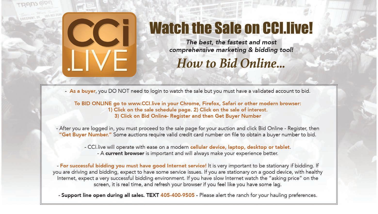 We hope to see you on sale day, however, we realize that is not always possible . For those unable to attend in person, there will be several ways to participate . Kate Roberts has videoed the bulls and will handle bids through the CCI internet system on sale day . Details about viewing the videos or bidding online can be found inside the front cover All of the consignors will be available to assist you in making your bull selections Additionally, there will be several Sale Representatives available to handle a bid for you If we can be of any assistance, please give us a call .