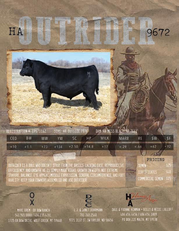 OXBOWRANCHANGUS.COM Performing from Montana and the Dakotas to the Great Basin to the Mexican Border. BULLS ARE RAISED IN A RUGGED, STEEP ENVIRONMENT WITHOUT CREEP, IRRIGATED PASTURES AND FOOT TRIMMING. OX BOW RANCH SPRING SALE WEDNESDAY | MARCH 1 ST , 2023 | 1:00 PM AT THE RANCH IN WOLF CREEK, MONTANA - LUNCH AT NOON FULL CALENDAR YEAR GUARANTEE selling All bulls are Freeze Branded, BVD tested, and Breeding Soundness/Fertility Exam. 100 Head of Yearling + 2 Year Old Bulls