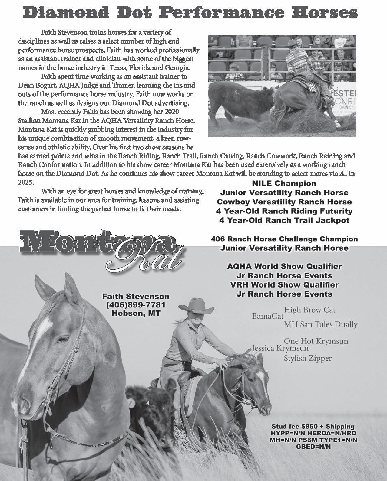Faith Stevenson, our oldest daughter, creates all the ads for Diamond Dot and runs our Social Media. Along with her successful horse training business, Faith helps out on the ranch anywhere she is needed.