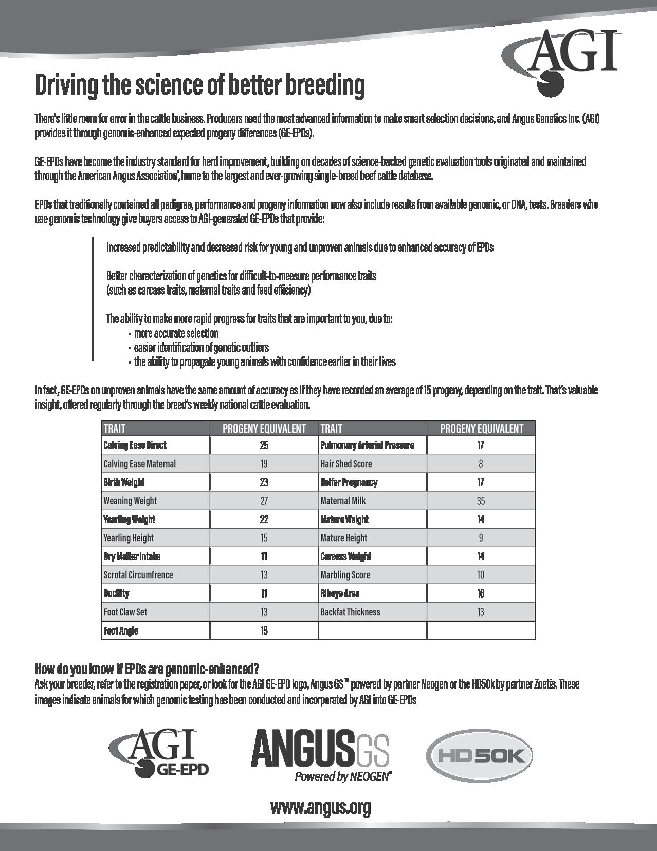Complete performance information is provided for each animal. The ratios are calculated in separate contemporary groups and conditions they were raised under, so that a ratio of 100 will not necessarily correlate to the same weight between the different groups. We have calculated interim EPDs for cattle that do not yet have official EPDs. Expected Progeny Difference (EPD) is the estimate of how future progeny of each sire are expected to perform in each of the traits listed. EPD is expressed in pounds, either plus or minus. For example, when used on the same cows, calves sired by a bull with a +40 weaning EPD should average 10 pounds more than those sired by a bull with a +30 weaning EPD. EPDs in this catalog are current as of press time.