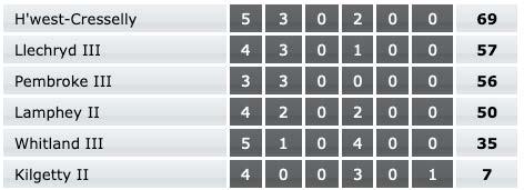 Haverfordwest/Cresselly bowled out Kilgetty II for 41 and knocked off the target in just 42 balls to take command of Division 6. Llechryd III held on in a tight 11-run win over Lamphey II, while Pembroke III edged a 2-wicket win over Whitland III.