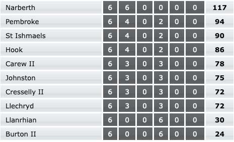 Narberth kept their perfect record with a dominant 93-run win at Llanrhian. Jamie McCormack (70) and Kyle Williams (60no) powered Narberth to 257-4. Lewys Jones (327) and Matthew Johns (3-30) sealed the win.