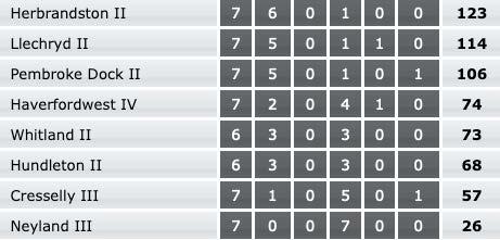 Llechryd II (122-8) tied with Haverfordwest IV (122-8)