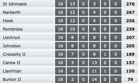 Pembroke (101) lost to St Ishmaels (104-7) by 3 wkts