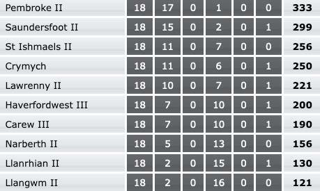Saundersfoot II (0) w/o v Llangwm II (0) St Ishmaels II (210-5) lost to Lawrenny II (212-3) by 7 wkts