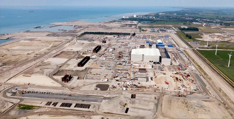 The Rødbyhavn construction site with the tunnel factoryunderconstructioninthecentre.ImagecourtesyofFemernA/S.