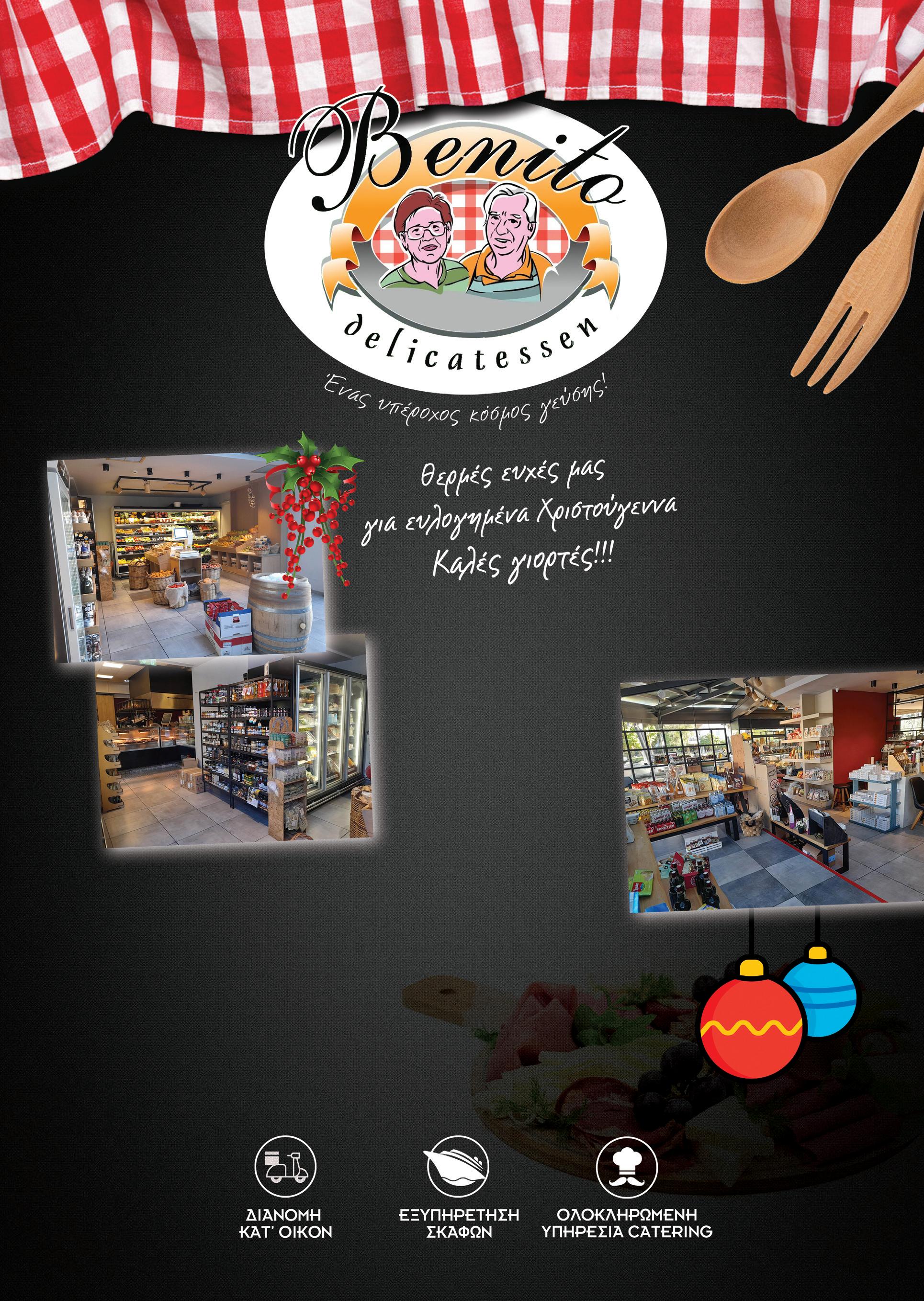 Παράδοση στην ποιότητα από το 1928 Κατάστημα Φαλήρου: Θέτιδος 22 Π. Φάληρο 175 61 Τ: 210 9837 677 Κατάστημα Γλυφάδας: Γρ. Λαμπράκη & Αγ. Νικολάου 48 Γλυφάδα 166 75 Τ: 210 9604 700 e mail: glyfada@benitodelicatessen gr Γραφεία: Χανίων 11, Αγ. Δημήτριος 173 42 Τ: 210 9854 585 - 586, F: 210 9854 555 e mail: info@benitodelicatessen gr facebook.com/benitodeli Μοναδικό delicatessen σε ευχάριστο και φιλικό περιβάλλον στην καρδιά του Π. Φαλήρου & τώρα και στη Γλυφάδα, όπου προσφέρουμε ιδιαίτερες γεύσεις και προτάσεις.