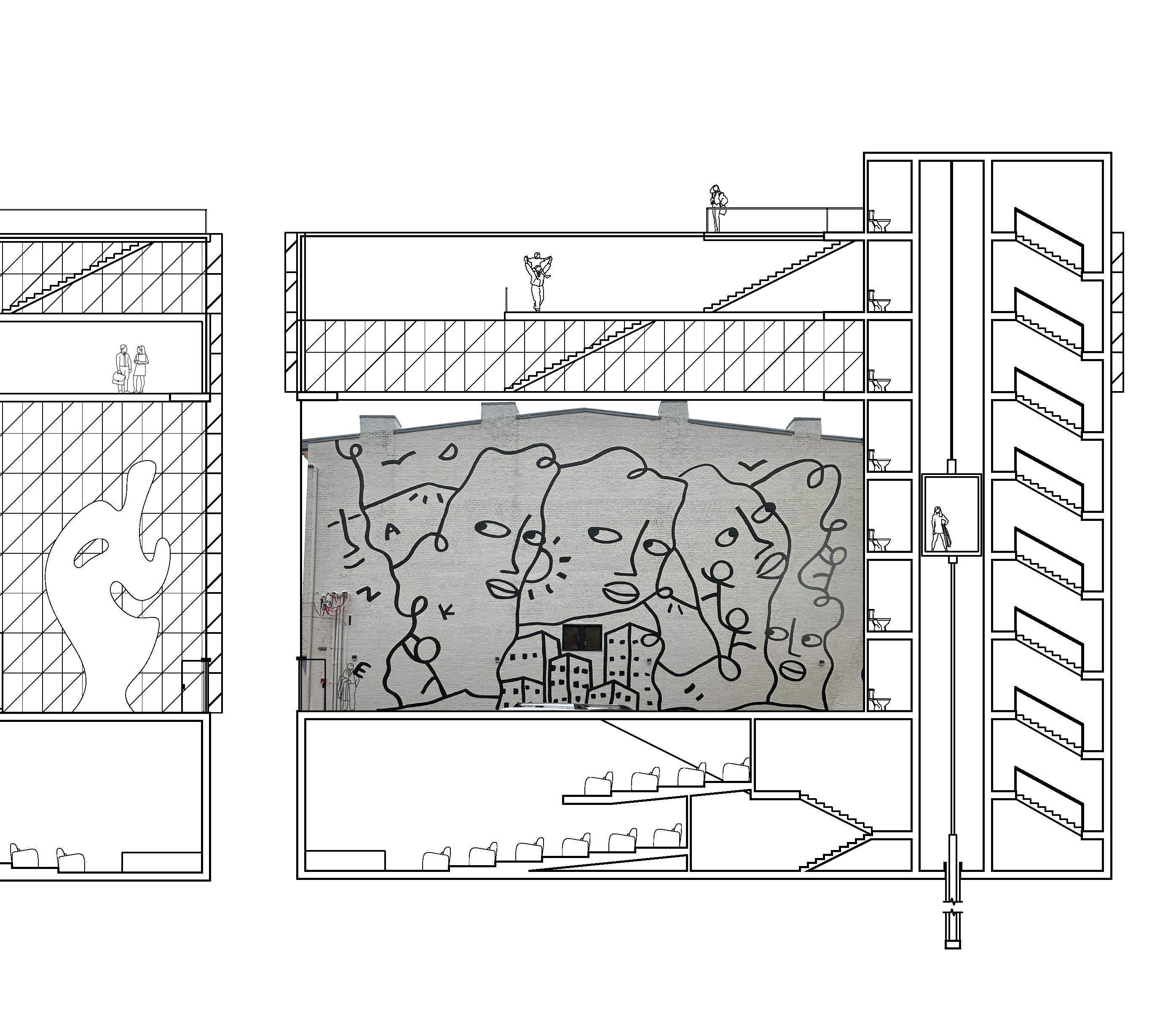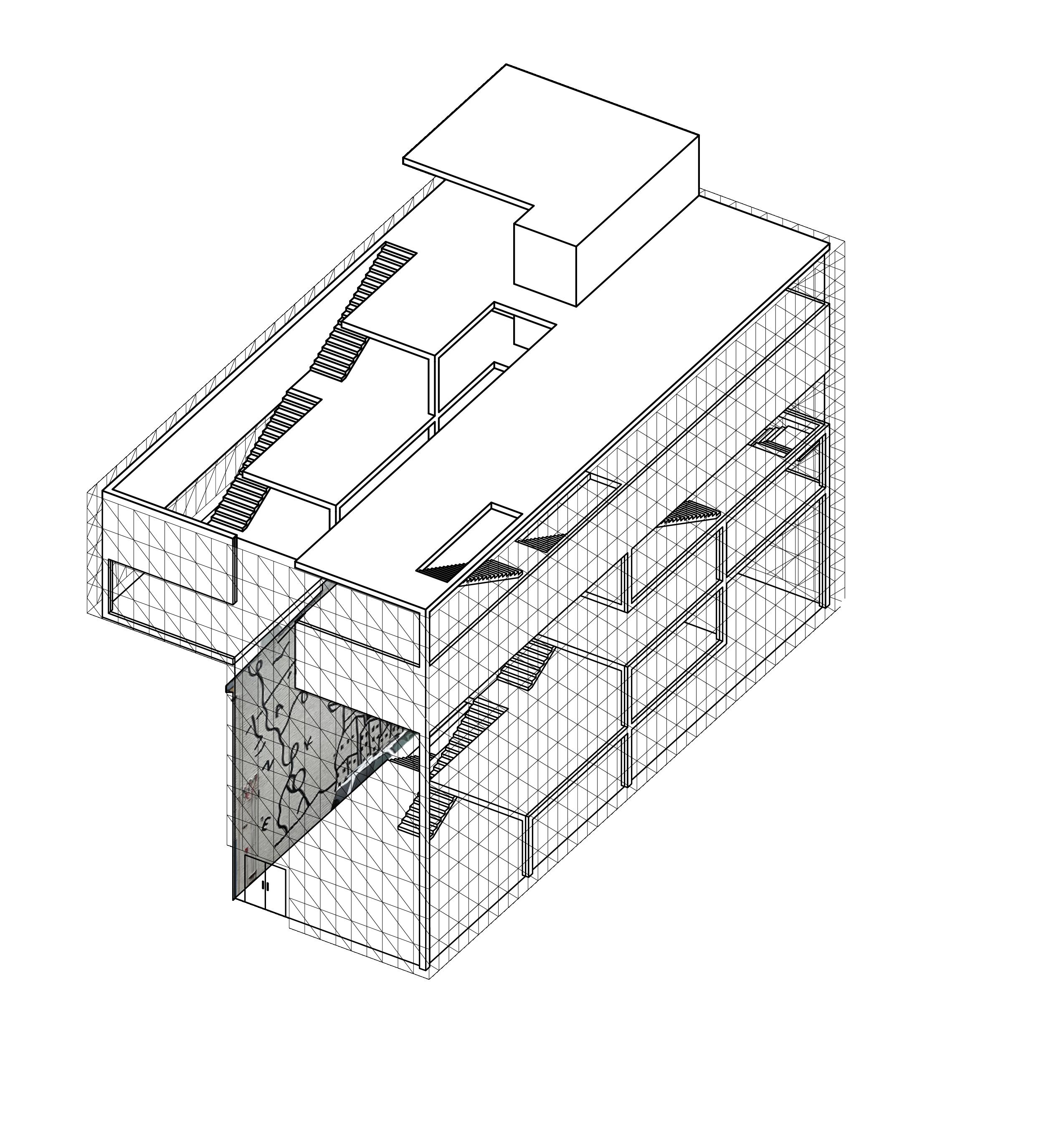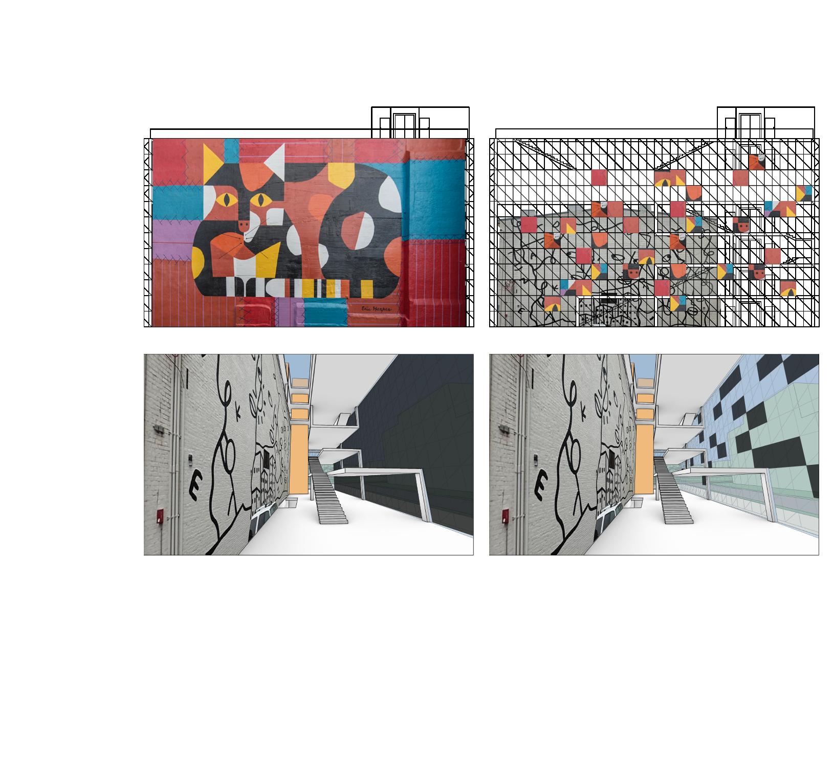 The Cincinnati ArtWorks Center serves as a museum and community gathering place for the young art ists of southwestern Ohio. This building is designed to frame a mural previ ously painted by the Art Works Mural Studio which strives to amplify creative youth through public art displays. Raising private spaces above the existing structures allows visitors to admire the mural as they climb through the galleries. At the summit, a cafe and roof garden offer direct views of downtown and the extending city fabric.
