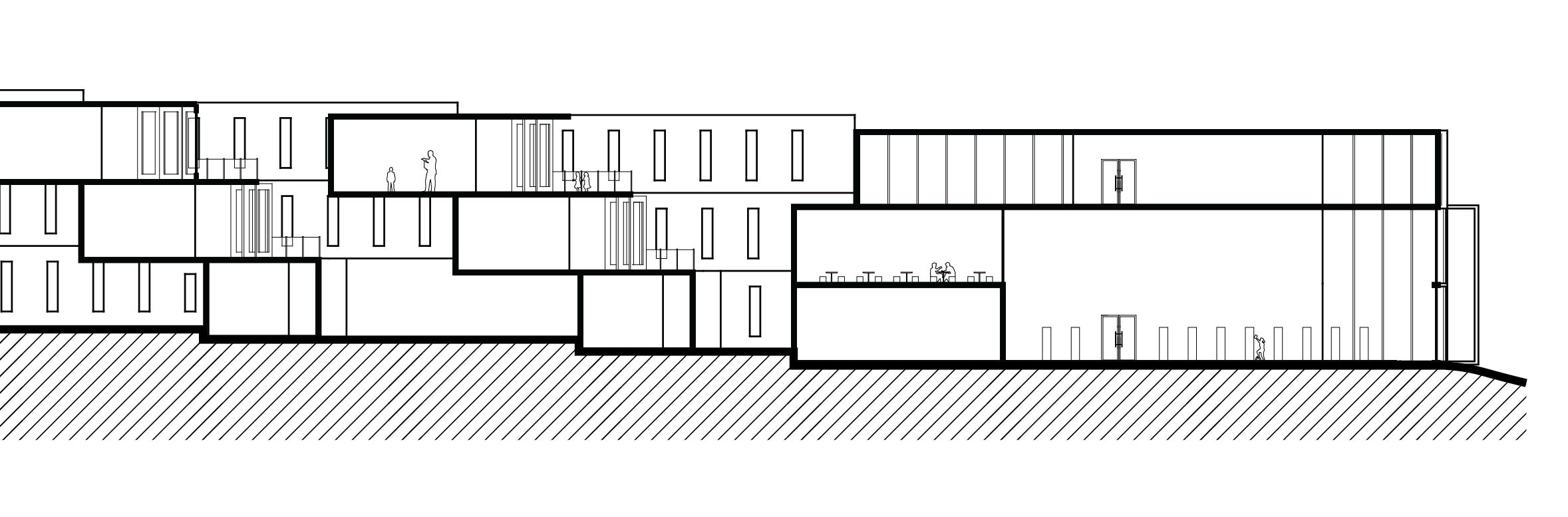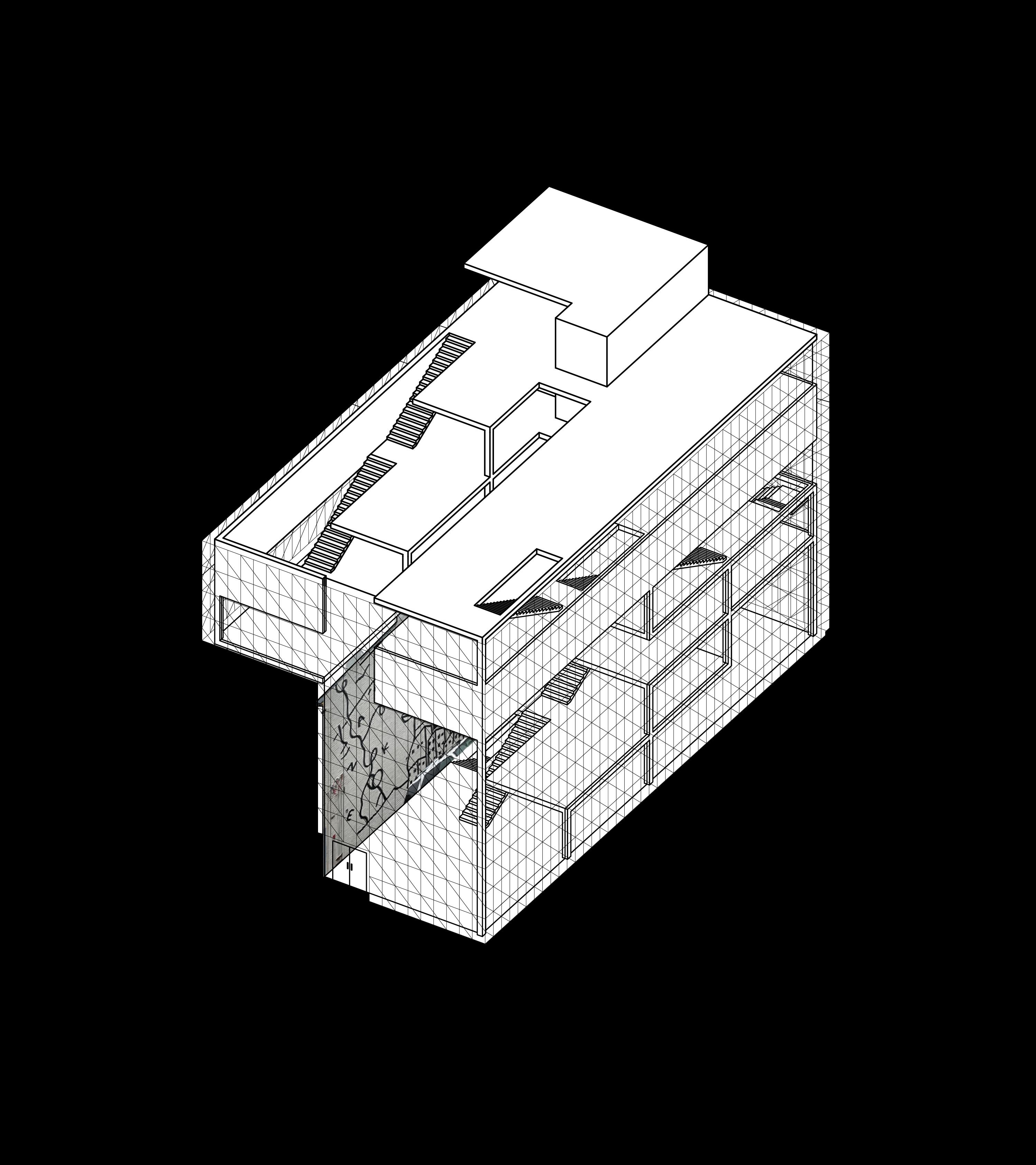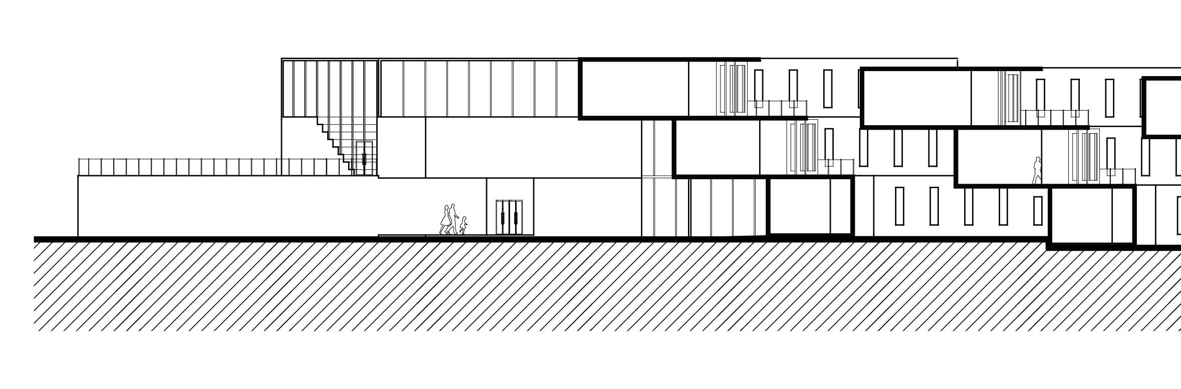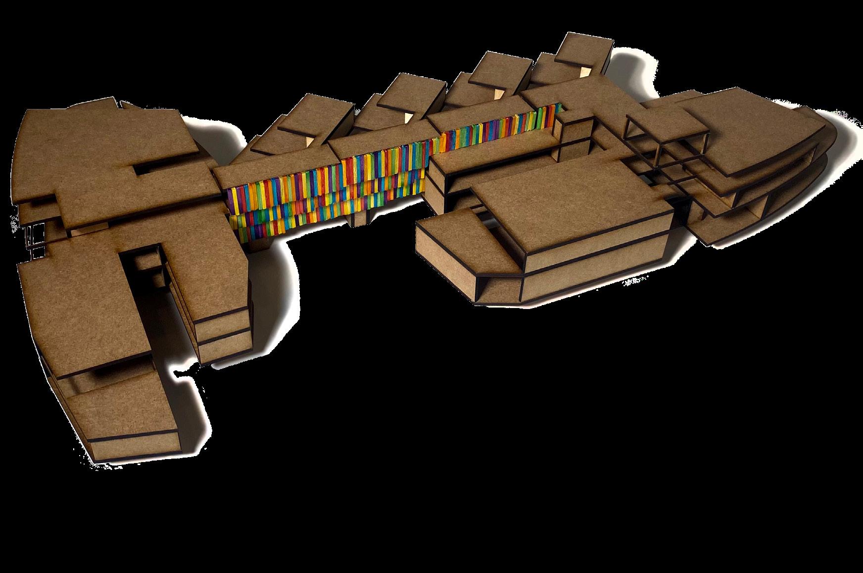 The Cincinnati ArtWorks Center serves as a museum and community gathering place for the young art ists of southwestern Ohio. This building is designed to frame a mural previ ously painted by the Art Works Mural Studio which strives to amplify creative youth through public art displays. Raising private spaces above the existing structures allows visitors to admire the mural as they climb through the galleries. At the summit, a cafe and roof garden offer direct views of downtown and the extending city fabric.