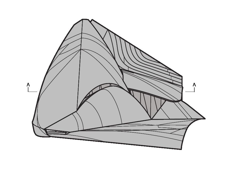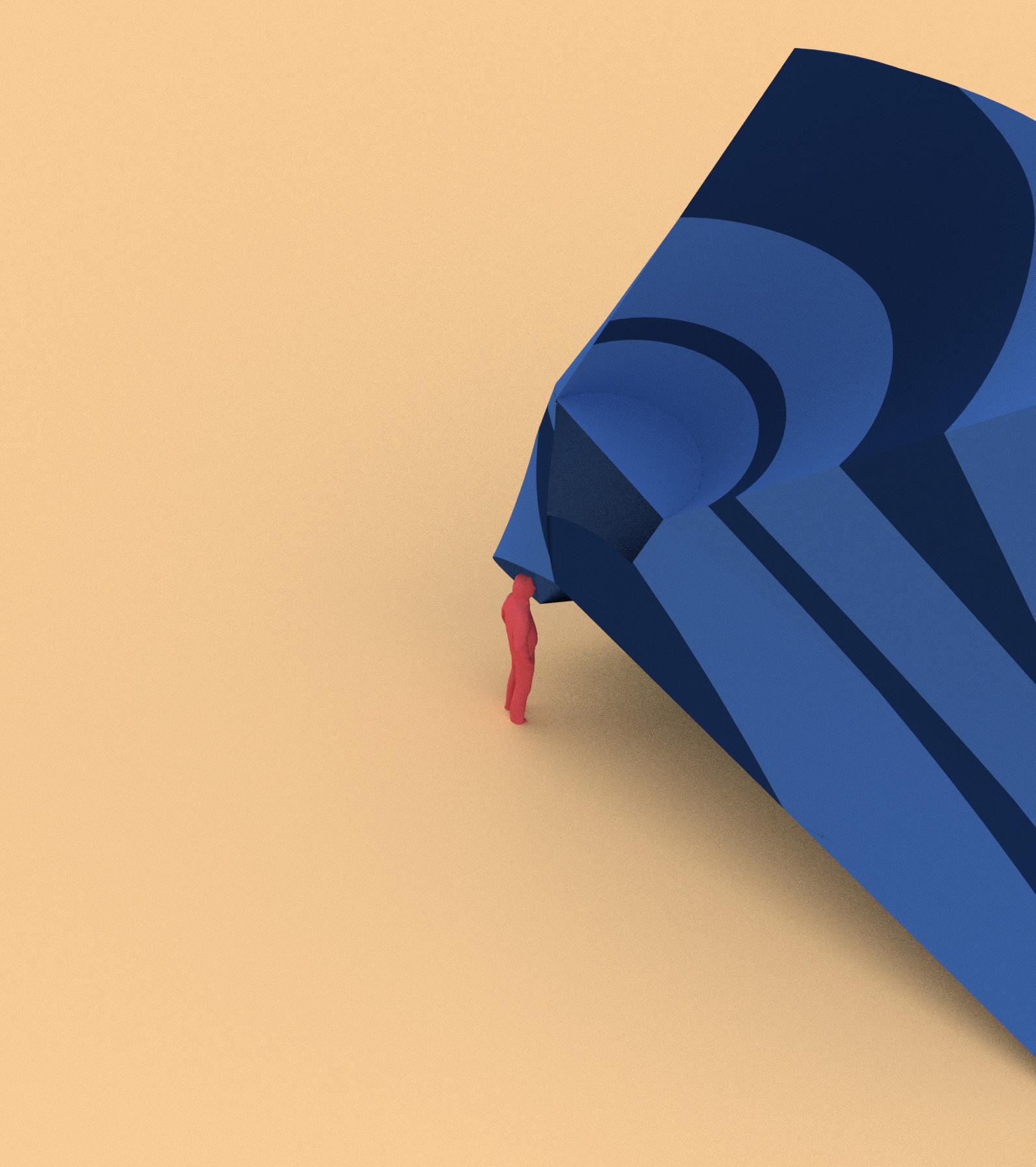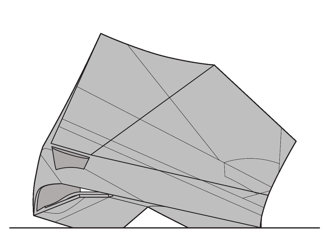 Situated on the site of the Vitra Design Campus, the pavilion serves to showcase a chair from the collection. To create this form, a plastic corner piece was unrolled and refolded per the steps outlined on the right. The resulting pavilion allows visitors to examine and interact with the chair, offering sneak peaks through ground level openings, inviting visitors to climb to chair viewing height. Upon arrival, the hovering platform on which the chair rests offers viewers a chance to take a seat without encouraging them to overstay.