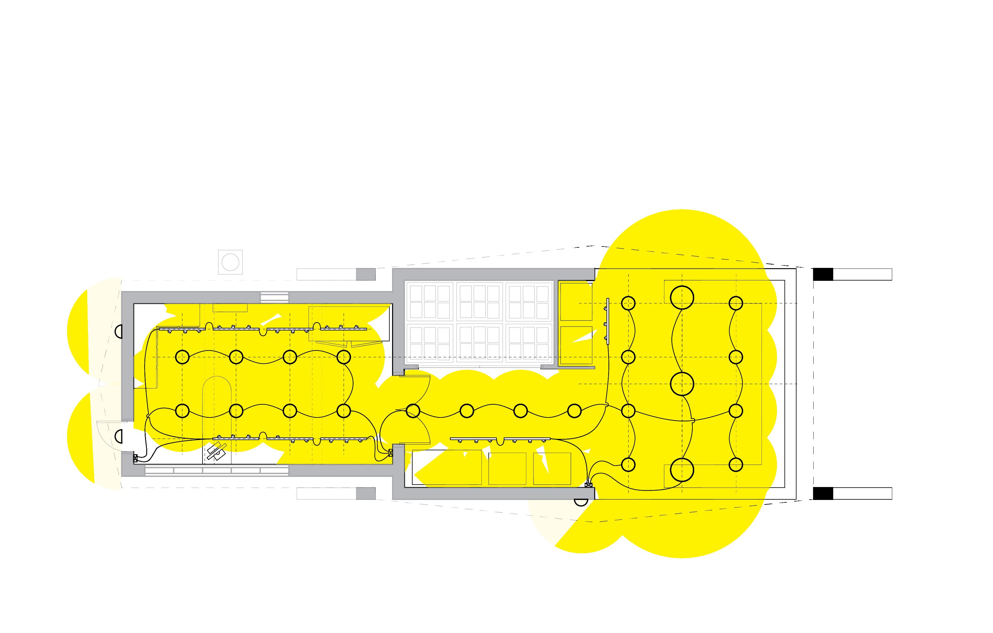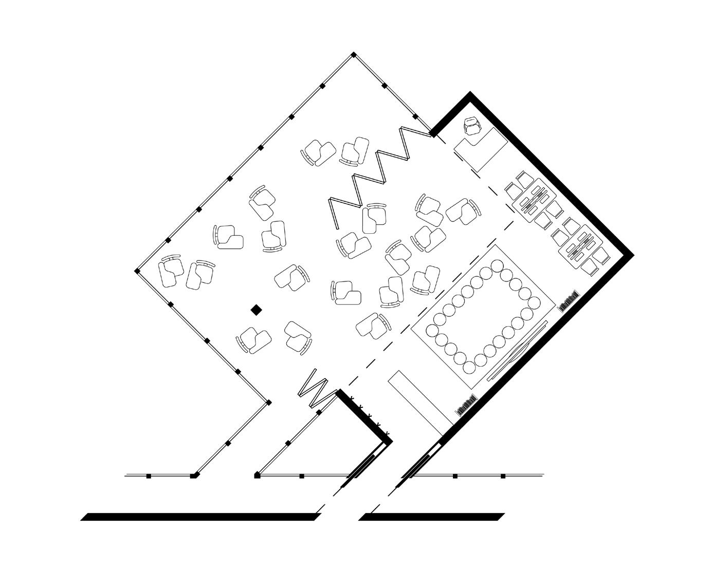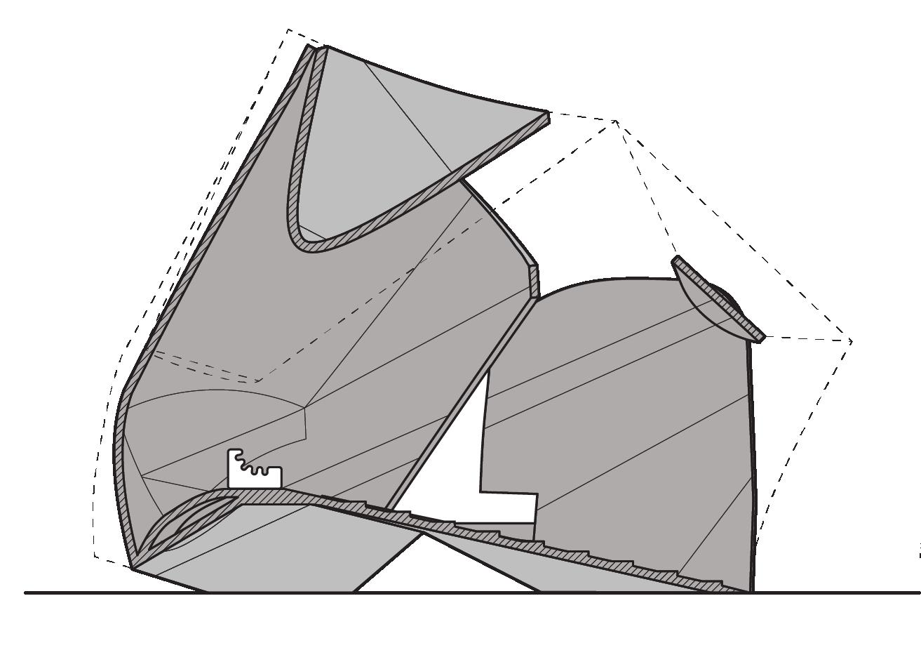 Situated on the site of the Vitra Design Campus, the pavilion serves to showcase a chair from the collection. To create this form, a plastic corner piece was unrolled and refolded per the steps outlined on the right. The resulting pavilion allows visitors to examine and interact with the chair, offering sneak peaks through ground level openings, inviting visitors to climb to chair viewing height. Upon arrival, the hovering platform on which the chair rests offers viewers a chance to take a seat without encouraging them to overstay.