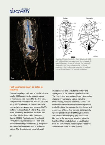 characteristics and a key to the solitary and aggregation of the recorded species is added. The distribution was analysed from 18 sampling stations in Terengganu waters including Pulau Bidong, Pulau Yu and Pulau Kapas. The collected data was then compiled with previous available global literature on the distribution and occurrence of these four species, consequently updating the biodiversity of Malaysian fauna and its worldwide biogeography distribution. Not only is the taxonomic report on salps the first from Malaysia but also it is a publication from the first author’s research grant Research Acculturation Grant Scheme (RAGS).