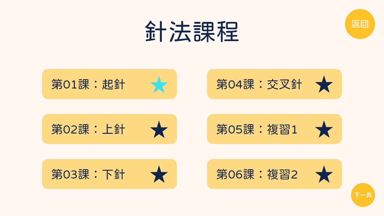 Mockup 棒針與鉤針皆可分成兩種課程類型,一種 是教基礎針法,例如最開始成形的起針、 接在後面的上針、下針...等針法;另一 種則是教導使用者如何編織一件成品,可 能是帽子、圍巾、襪子...等。 19