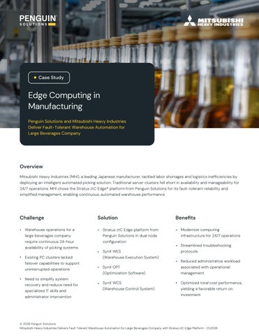 Mitsubishi Heavy Industries (MHI), a leading Japanese manufacturer, tackled labor shortages and logistics inefficiencies by deploying an intelligent automated picking solution. Traditional server clusters fell short in availability and manageability for 24/7 operations. MHI chose the Stratus ztC Edge® platform from Penguin Solutions for its fault-tolerant reliability and simplified management, enabling continuous, automated warehouse performance.