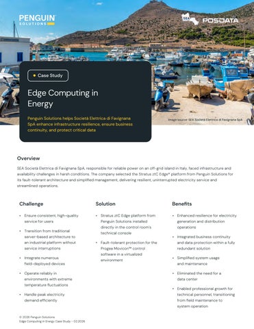 SEA Società Elettrica di Favignana SpA, responsible for reliable power on an off-grid island in Italy, faced infrastructure and availability challenges in harsh conditions. The company selected the Stratus ztC Edge® platform from Penguin Solutions for its fault-tolerant architecture and simplified management, delivering resilient, uninterrupted electricity service and streamlined operations.