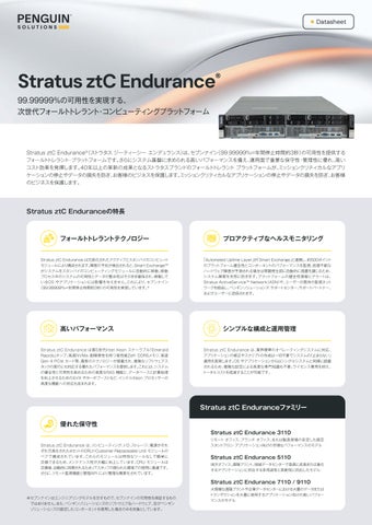 Stratus ztC Endurance®(ストラタス ジーティーシー エンデュランス)は、セブンナイン(99.99999%=年間停止時間約3秒)の可用性を提供する フォールトトレラント・プラットフォームです。さらにシステム基盤に求められる高いパフォーマンスを備え、運用面で重要な保守性・管理性に優れ、高い コスト効果を発揮します。40年以上の革新の成果となるストラタスブランドのフォールトトレラント プラットフォームが、ミッションクリティカルなアプリ ケーションの停止やデータの損失を防ぎ、お客様のビジネスを保護します。ミッションクリティカルなアプリケーションの停止やデータの損失を防ぎ、お客様 のビジネスを保護します。