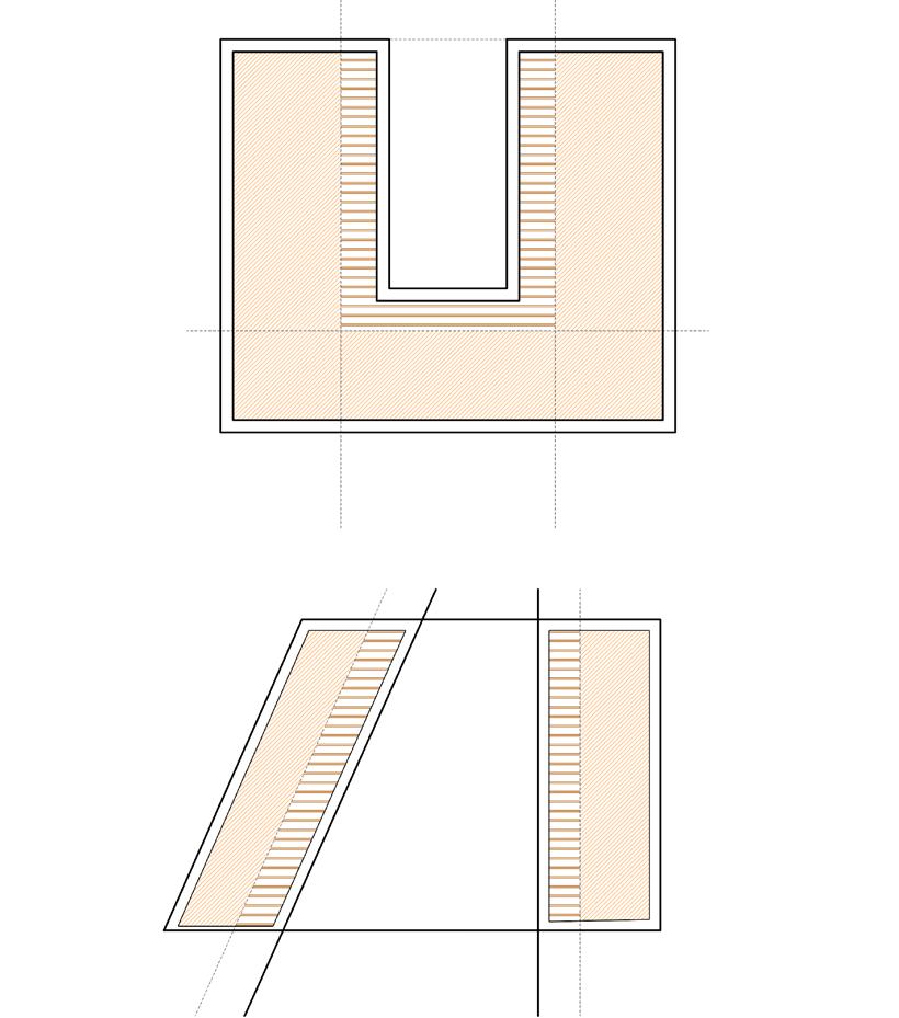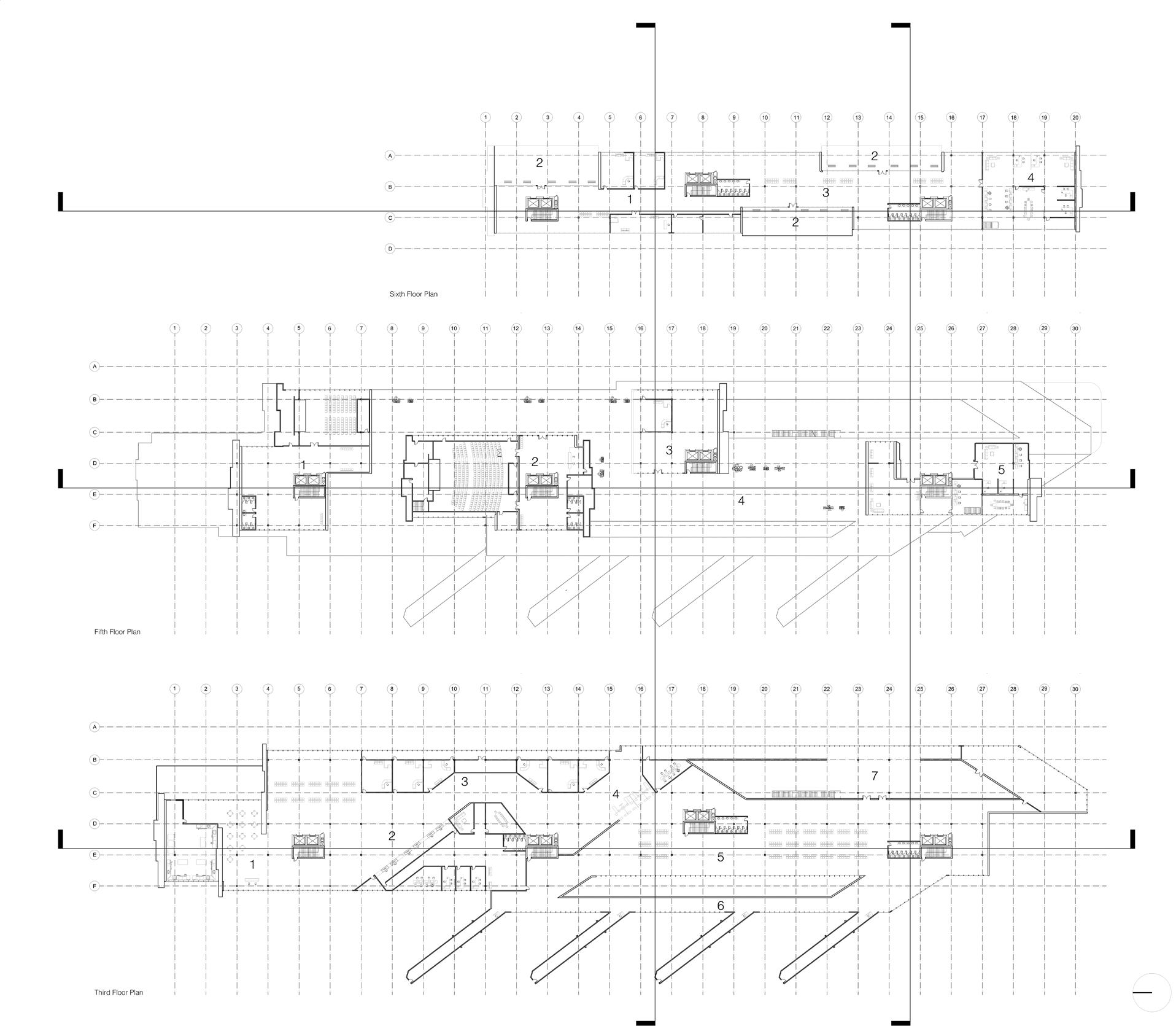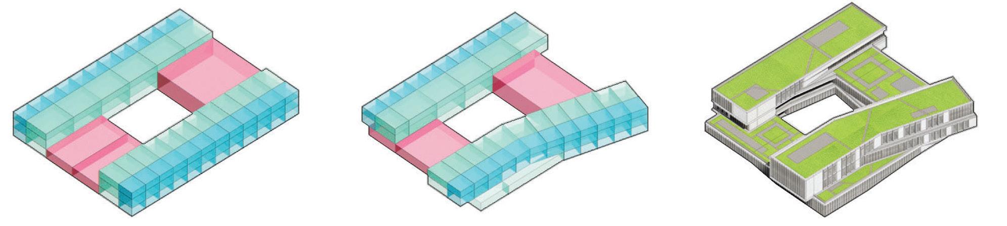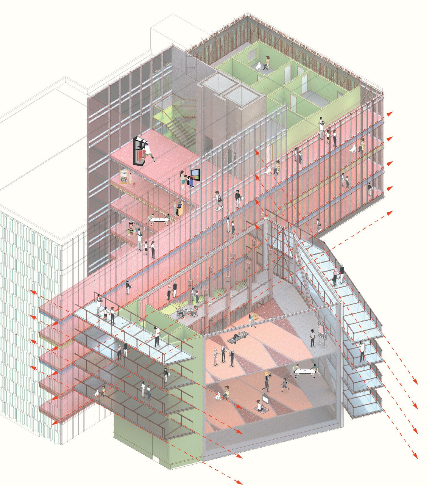 Hallways The “Sliced-Opened“ Axonometric drawings demonstrate the spatial hierarchy between private and public programs and the important role of the hallways for social space and circulation.