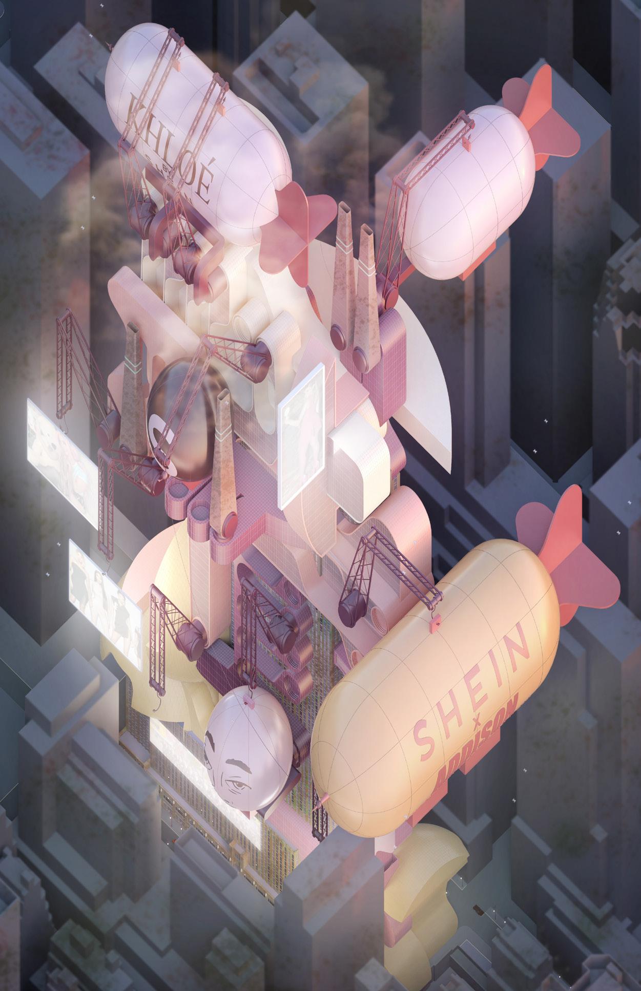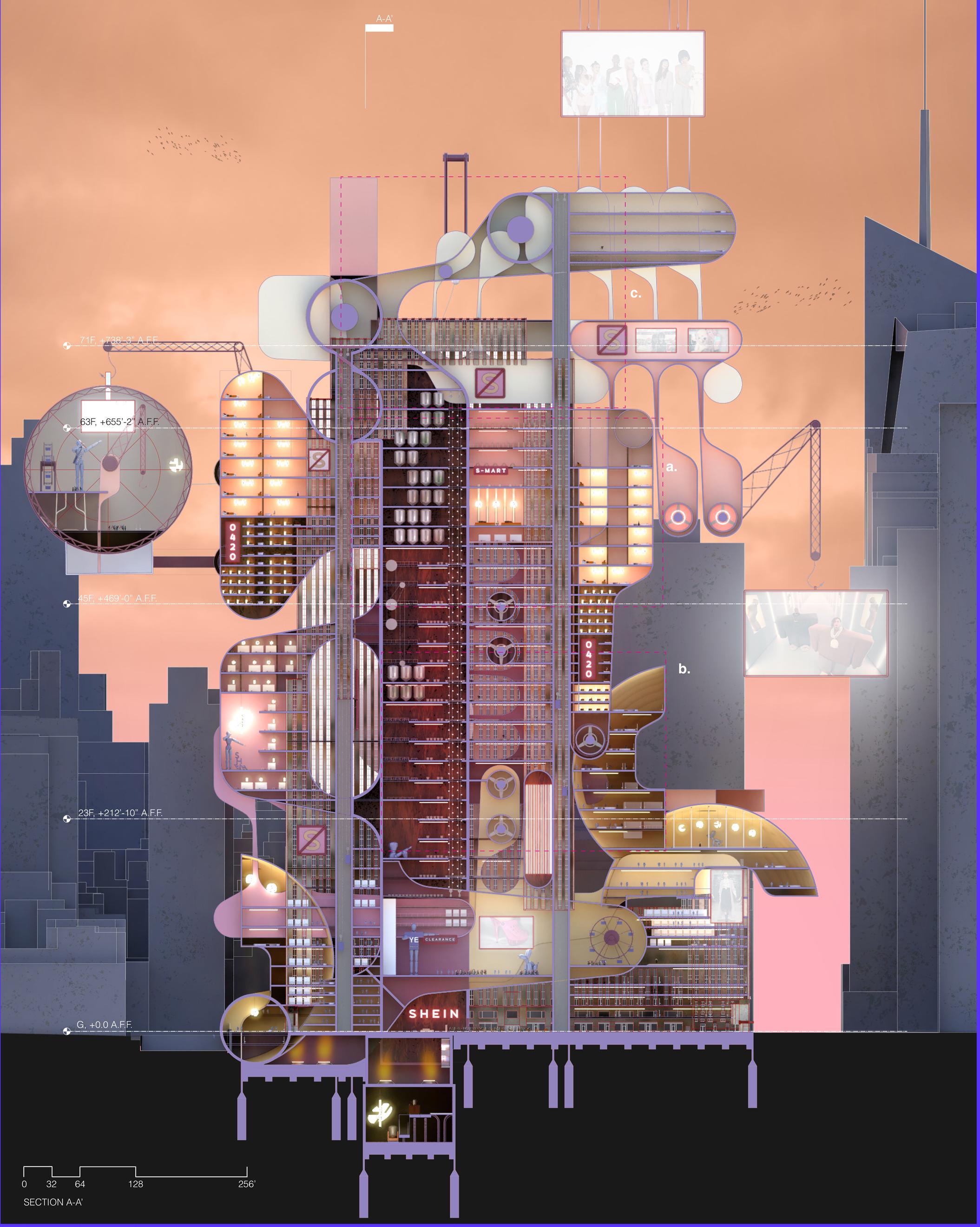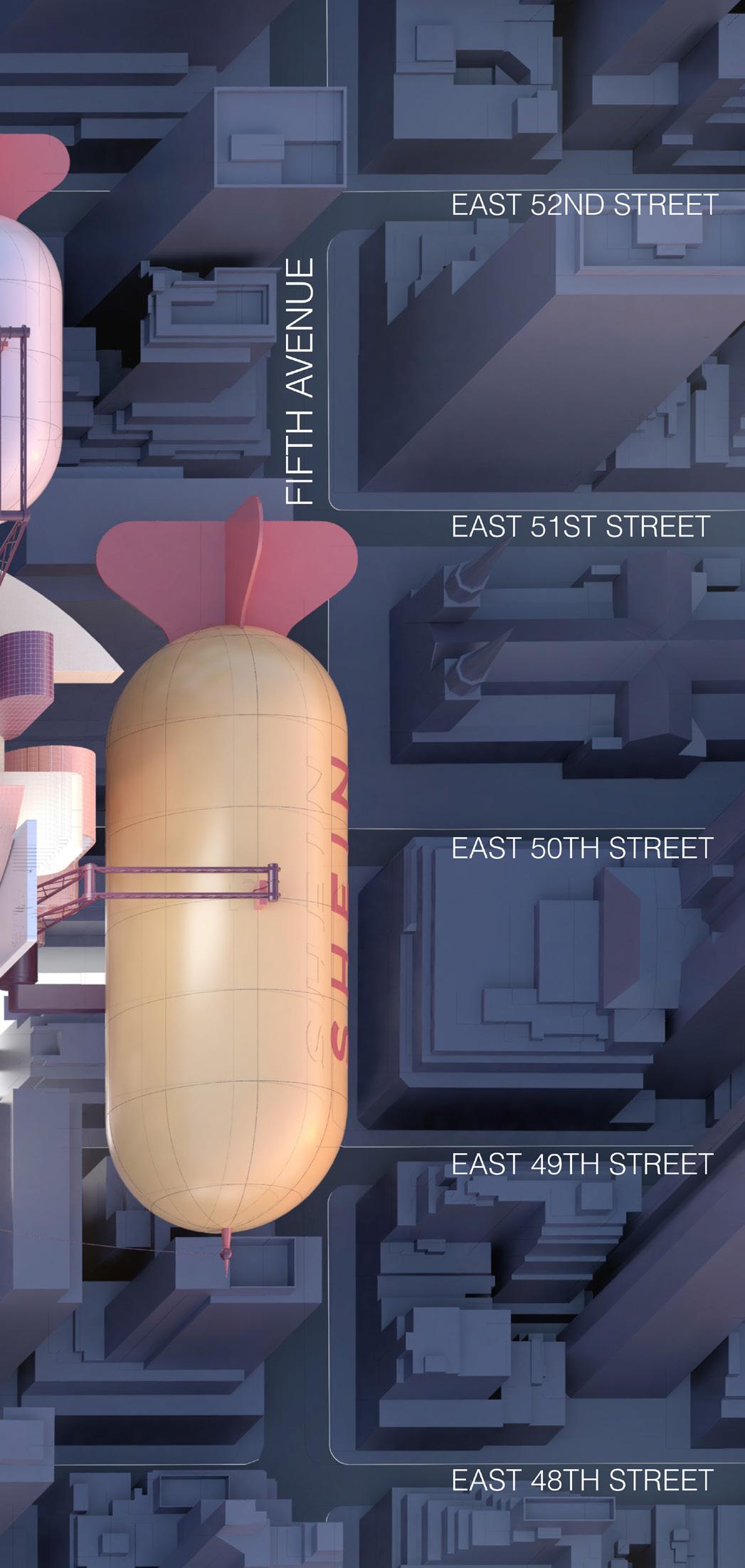 Shein has taken the title of the fastest fast-fashion company by applying this fast-fashion model to an extreme. Shein is committed to making fashion accessible to all, and by reaching consumers in more than 150 countries, the production and consumption of their products is a global effort. Throughout history, NYC has been a home for immigrants and a significant fashion capital of the world. Due to the migrant crisis, NYC’s shelter system faces a breakdown due to the city’s ‘right to shelter’ law. A Shein complex at 30 Rockefeller Center would celebrate the absurdity of the fast-fashion model and alleviate the strain placed on the NYC shelter system. Shein is working to provide migrants with resources to survive in a new country, but at what cost? The design of the complex hides the dark powerhouse of the manufacturing plant by having a variety of publicaccess programs, such as offices and actively changing exhibition centers that disorient audiences away from the truth. However, Shein’s corner-cutting schemes also reflect in the HQ’s design, which will ultimately result in tenants finding the dark holes within Shein.