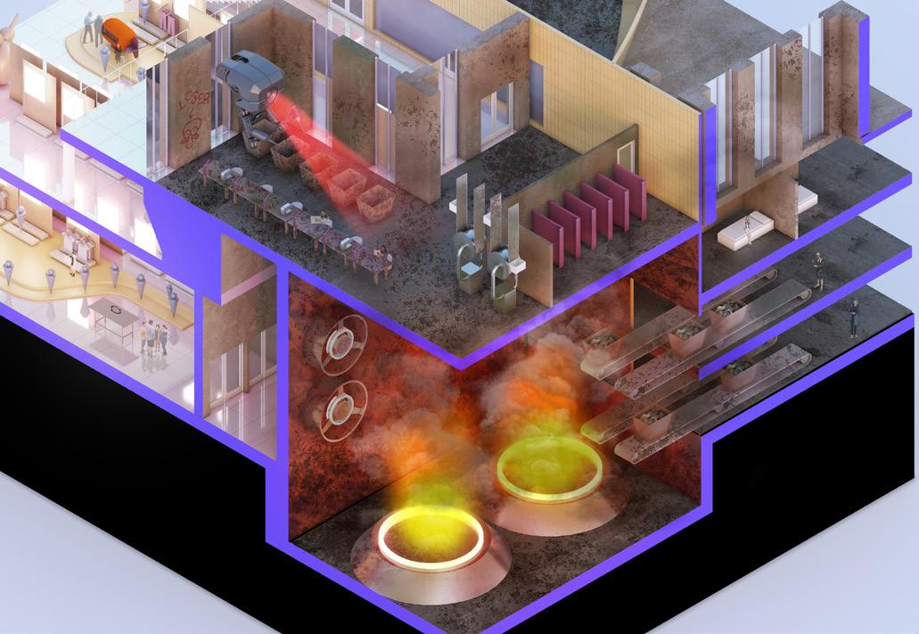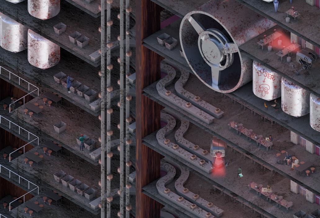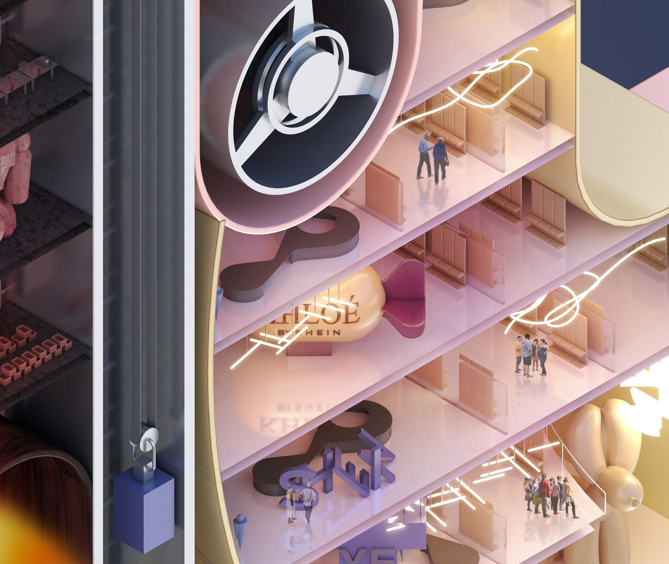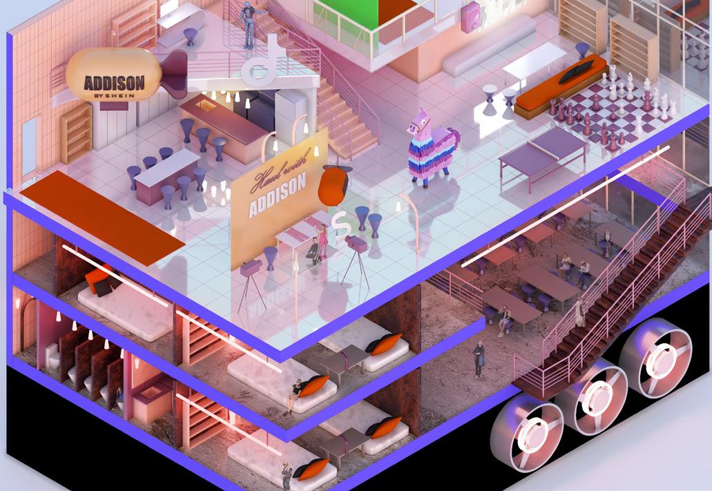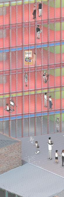 Shein has taken the title of the fastest fast-fashion company by applying this fast-fashion model to an extreme. Shein is committed to making fashion accessible to all, and by reaching consumers in more than 150 countries, the production and consumption of their products is a global effort. Throughout history, NYC has been a home for immigrants and a significant fashion capital of the world. Due to the migrant crisis, NYC’s shelter system faces a breakdown due to the city’s ‘right to shelter’ law. A Shein complex at 30 Rockefeller Center would celebrate the absurdity of the fast-fashion model and alleviate the strain placed on the NYC shelter system. Shein is working to provide migrants with resources to survive in a new country, but at what cost? The design of the complex hides the dark powerhouse of the manufacturing plant by having a variety of publicaccess programs, such as offices and actively changing exhibition centers that disorient audiences away from the truth. However, Shein’s corner-cutting schemes also reflect in the HQ’s design, which will ultimately result in tenants finding the dark holes within Shein.