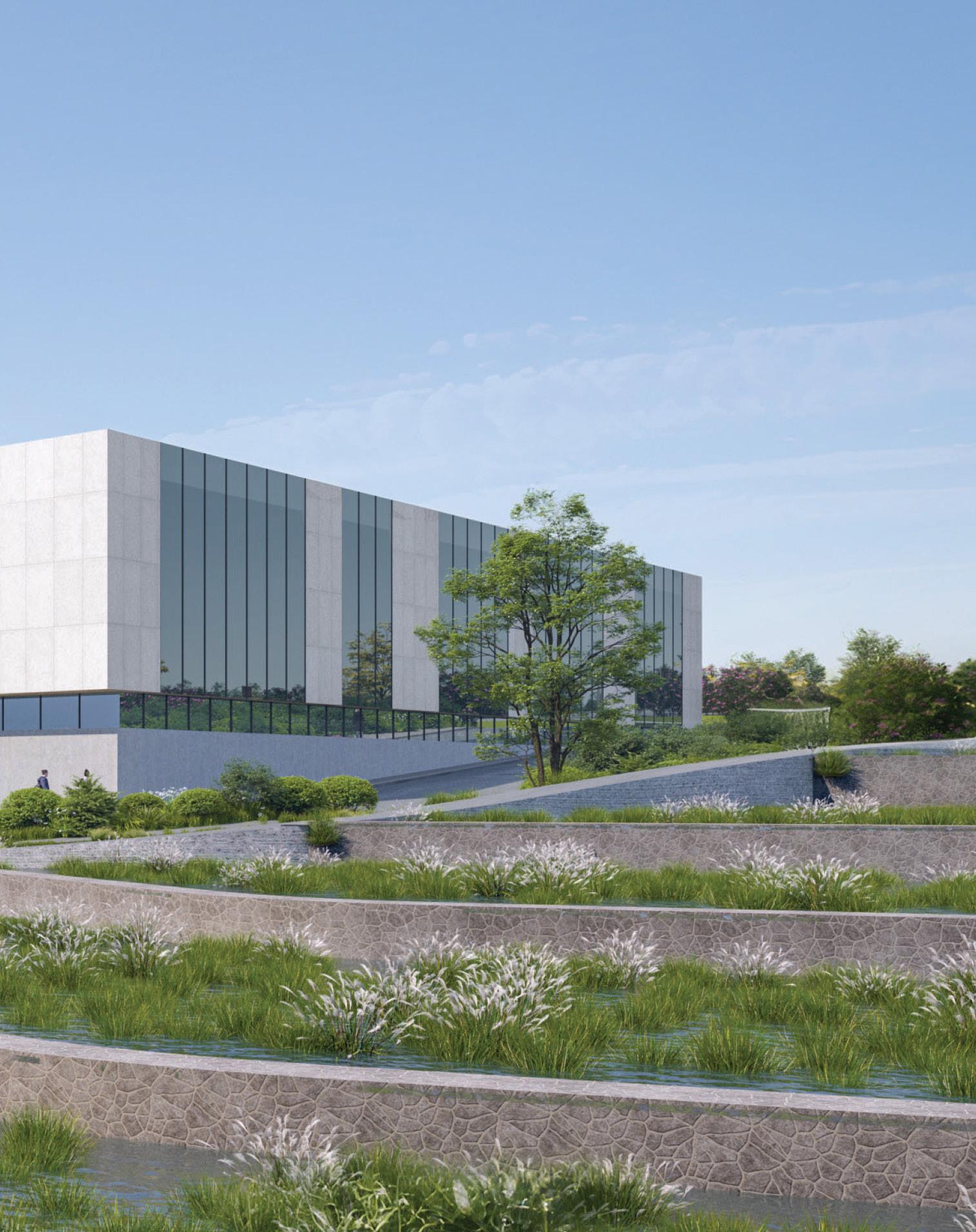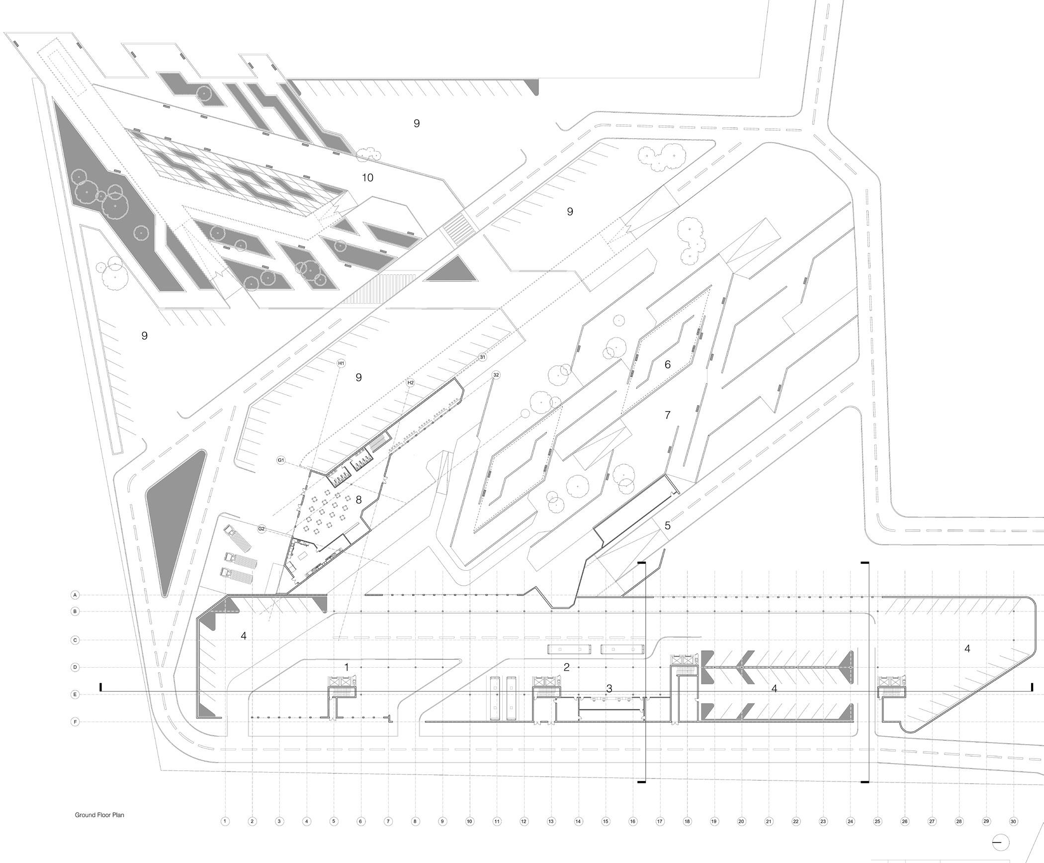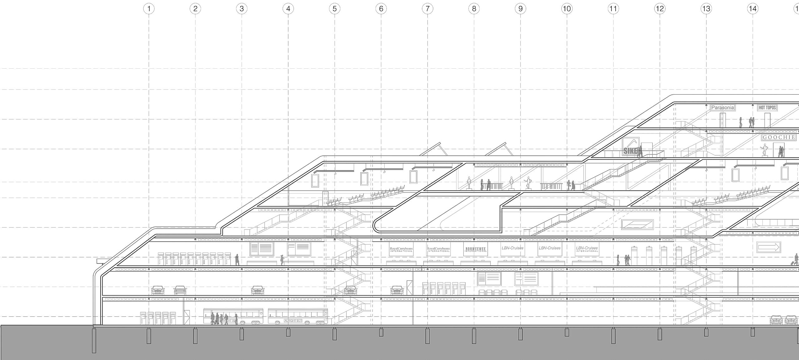 Typology from bar shaped terminal stepping down to the ground condition of the memorial, to create the protection layer.