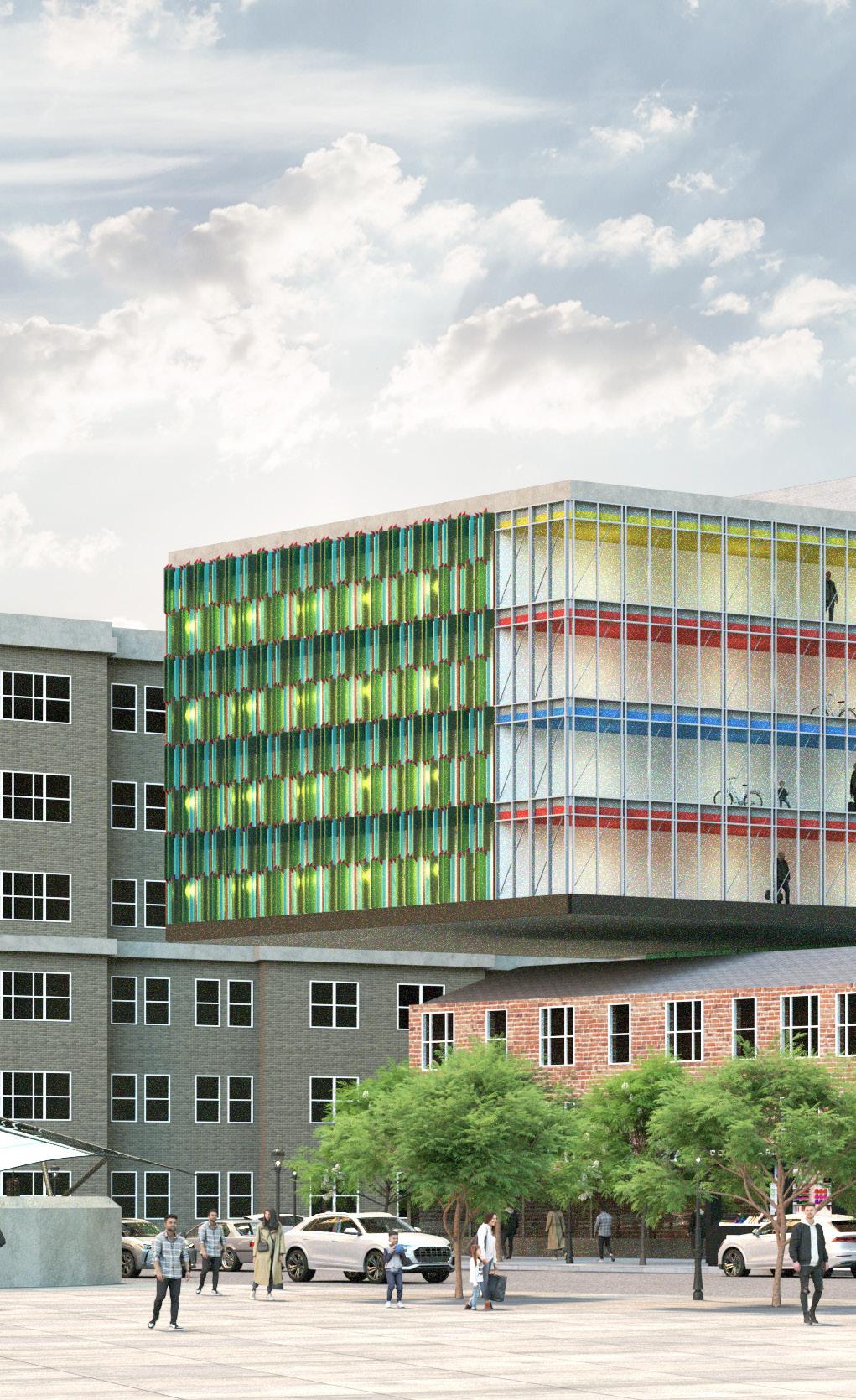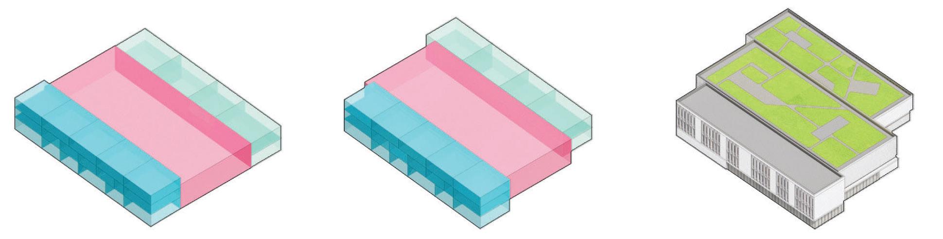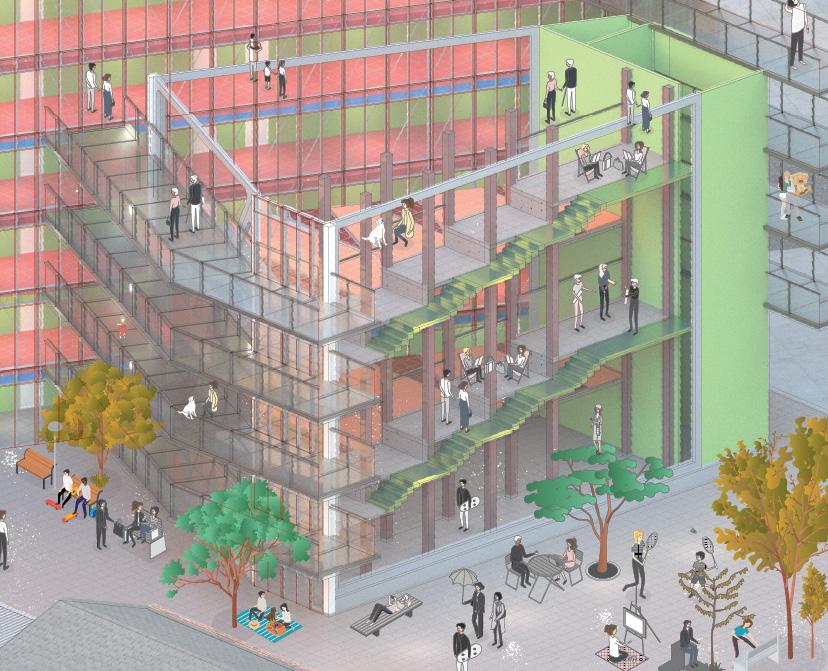 THE VOID is created through the massing shift from a singular linear bar into a series of articulated volumes. This transformation pulls the building apart, carving a void between solid elements and allowing light, air, and circulation to pass through. Rather than functioning as leftover space, the resulting void becomes a deliberate outdoor gathering room, it supports informal occupation, and invites moments of pause within an otherwise transit-driven environment.