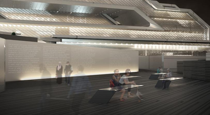 The 2020 Beirut Explosion left an everlasting impact on Lebanese society-- at least 191 individuals perished in the blast, and multiple counts of infrastructure are still yet to be repaired from the wounds inflicted by the catastrophe. Jutting Voids is a terminal-memorial complex that would replace the currently defunct Passenger Terminal at Beirut’s Port Authority and is intended not only to circulate passengers from naval passenger and cruise lines but also to honor those who fell in this untimely explosion.