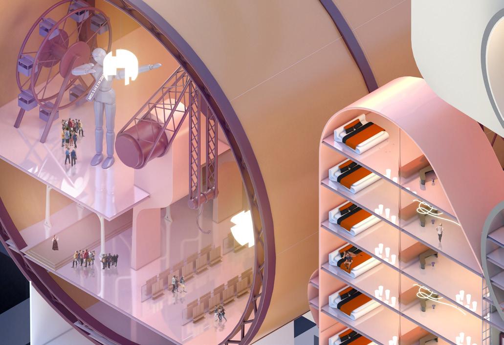 Within the residential zones, single-loaded corridors on each floor function as social spaces rather than purely utilitarian passages, connecting apartments to a central vertical “playground.” Floor-level lobbies are programmed with shared activities, encouraging movement, interaction, and a sense of collective life throughout the building.