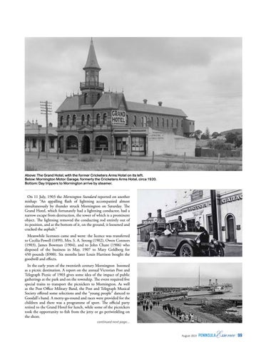 Above: The Grand Hotel, with the former Cricketers Arms Hotel on its left. Below: Mornington Motor Garage, formerly the Cricketers Arms Hotel, circa 1920. Bottom: Day trippers to Mornington arrive by steamer.
