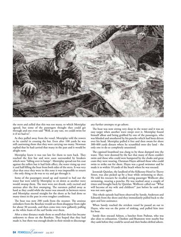 the stern and yelled that this was too many, to which Mentiplay agreed, but some of the passengers thought they could get through and one even said “Well, at any rate, we could swim for it if we had to”. As they pulled away from the vessel, Mentiplay told the rowers to be careful in crossing the bar. Even after 100 yards he was still cautioning them that they were carrying too many. Newman replied that he had carried that many in the past and it would be alright now. Mentiplay knew it was too late for them to turn back. They reached the first bar and were soon surrounded by breakers which were “falling over in lumps”. Mentiplay spread out his coat against the rollers but it had little effect, the water rising up over it and half filling the boat from both sides of the stern. It was very clear that once they were in this zone it was impossible to return - the only thing to do was to try and get through it. Some of the passengers stood up and wanted to bail out the water but were told by Mentiplay to sit down as another wave would swamp them. The men were not drunk, only excited and anxious after the first swamping. The oarsmen pulled away as hard as they could while the water was smooth in between waves and Mentiplay steered straight for the shore as he had done so many times in the past in even rougher conditions. The boat was now 200 yards from the steamer. The anxious onlookers from the Resolute would see them disappear from sight for about 30 seconds, and then come into view gallantly pulling as the white foam of the surf broke over them. After a time distance made them so small that their fate became unknown to those on the Resolute. They hoped that they had made it, but there was enough doubt in their minds to discourage