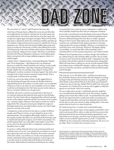 We can do this. It’s “natural” right? People do this every day. concerted effort not to catch my eye as I attempted a confident smile, which probably looked more like I had just undergone a lobotomy. I don’t know if the pain factor is different for mums who are left to their own bodily devices, but I had to watch the love of my life scream and An eon later I was allowed to enter the theatre and sit next to Phenomown bodily devices, but I had to watch the love of my life scream and A-Mum’s head, hiding behind a big blue sheet that shielded me from crumple up in agony again and again and again. Phenom-A-Mum had the terrors of blood and guts that were about to unfold. I grasped been given a chemical to induce her contractions and they seemed to go Phenom-A-Mum’s hand, likely taking more comfort from her than she into overdrive. Hollywood has much to answer for with their lies, from my could from me, and listened as the surgeons got down to business, experience now. Women don’t lean forward slightly, fake scream and muttering about her enormous bladder, oblivious or uncaring that we curse you as they do in the movies, as if they were suffering from a bout could hear every word. (Seriously. Hilarious!). She began shaking of food poisoning. In the real world they are forced into a foetus position, uncontrollably, an actual side-effect of the anaesthetic which I every muscle taut, calling out to you in pain. Then there is a momentary remembered from our first cesarean experience, and I held my breath. lull where all of the pain disappears, tricking you into breathing again, “Whatever kind of greater power is out there, though I don’t believe in before coming back with an angry stabbing vengeance. Labour is a you, please bring my wife and baby safely out of this. My son needs sadistic bugger. his mum so much more than he needs his dad”. A desperate man calls I held her hand. I rubbed her back. I said stupid things like “Breathe” out silently when all other methods of control have been extinguished. and “You’re doing great”. I did nothing of any use whatsoever What’s left when there is nothing you can do to fix the situation? When because no matter how hard I tried there was nothing I could actually even Indiana Jones would be left, impotent, unable to whip any Nazis do to make her feel better. I did make a bloody good leaning post into line to solve this conundrum. Just hold her hand and think insanely though; whether she was standing, lying, sitting or rocking on the positive thoughts. birthing ball I could be counted on to be leant against. Yep, that’s what “Waaaaaaaaaaaaaaaaaaaaaaaaaaaaaaaaah!” I brought to this critical moment in parental companionship. Only a Holy crap-oly, it’s out. The baby’s alive... and they are a ginormous wooden plank could have done any better. pair of testicles! Must be a boy! And just like that (imagine me clicking To all of you soon-to-be-dads out there I loudly suggest that you my fingers here) all of the fear and panic was gone. I was guided out look into birthing techniques like Lamaze, the Bradley Method or of the theatre as they stitched Phenom-A-Mum back up and asked if I Hypnobirthing (not at all as hippie or pocket-watch-y as it sounds) that wanted some skin-to-skin time. Really? With his dad? Cool, that would will give you tools to use when you are completely out of your depth. be awesome. So I hauled off my scrub top and snuggled a nuddy bub I wish that we’d looked into this. Hell, there are even online videos so against my man-boobs. And it was amazing. that you can learn it all from your lounge room! He was so light and so smooth, I could barely sense his weight but Amidst the wife-torture I noticed concerned looks on the faces of was overwhelmed by the feeling of his touch. We sat there, together, our midwives whenever they glanced at the read-out from the baby getting to know each other without words. I recommend that every dad monitor. Our bub’s heart rate was dropping further with each passing asks for this opportunity that is usually reserved for mums because it minute, so the surgeons made the call that it was time to move to option is magical and memorable, and may have attributed to the fact that I two - cesarean surgery. Phenom-A-Mum jokes now that we could’ve am the only one who can rock him to sleep, holding Little L in the same skipped all of the crazy pain and just gone straight into surgery at position that we found in our silent introduction. the beginning because we ended up there anyway, but I don’t laugh Our family became four in number and I could breathe again. because I seriously wish we had. My apologies if this recount seems overly negative and terrified. I don’t I changed into scrubs and stood to the side as a number of efficient want to put anyone off but, rather, to make sure that every soon-to-be people sorted Phenom-A-Mum out and whisked her down to the dad (even those for the second time) are better prepared than I was. operating theatre. The anaesthetist offhandedly chatted to us about Expect that it won’t be easy, search for ways to help your partner and the vaguely possible side-effects of a spinal block (the technique used make it a more wonderful experience for you both. I’ve heard that to stop the pain during this surgery), one of which was paralysis. You childbirth can be a spectacular and positive experience. The onus is on what? Paralysis? That’s not a side-effect, that’s freakin’ scary! Who you fellas. There’s no need to be as scared as I was. put my wife in the firing line for life in a wheelchair, just because we decided to have a child? It was this or nothing. That bub had to come out because both mum and baby were now at risk. I was ushered into an anteroom to wait as David Hawkins is a Mornington Peninsula based stay-at-home dad who realised that he needed to improve his Dadding. So he set himself the simple the surgical prep work was done. Rando