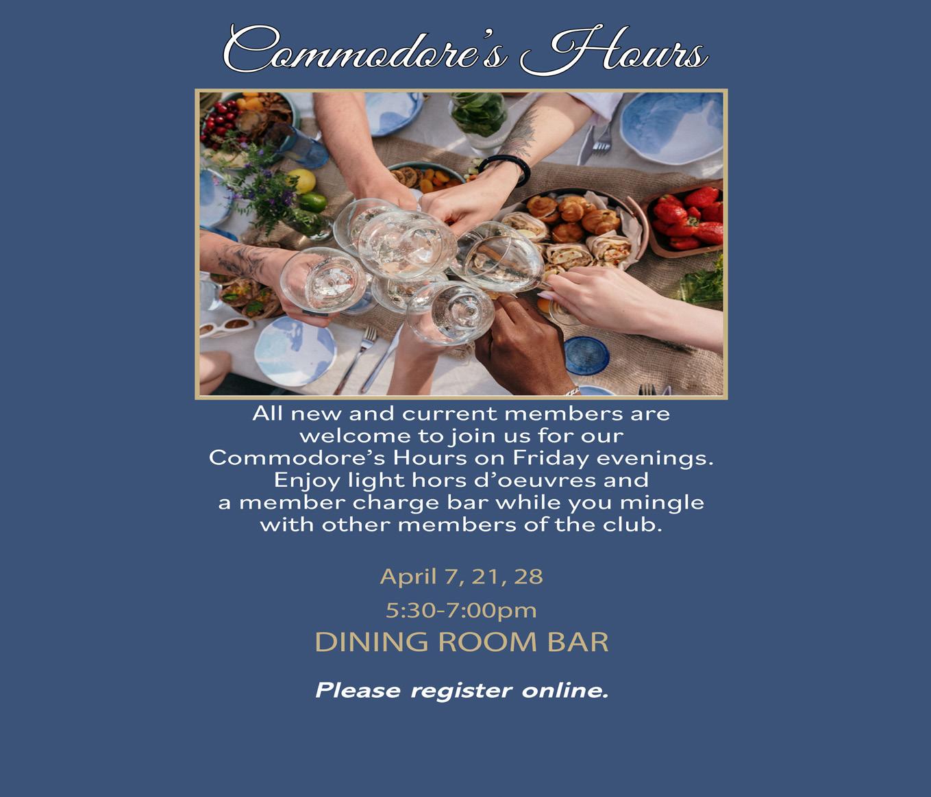 Our Commodore's Hours are a great way to get to know your fellow members of the club. Typically these events are held three times a month in the Dining Room Bar. Please register online at www.peninsulayacht.com to let us know you're coming!