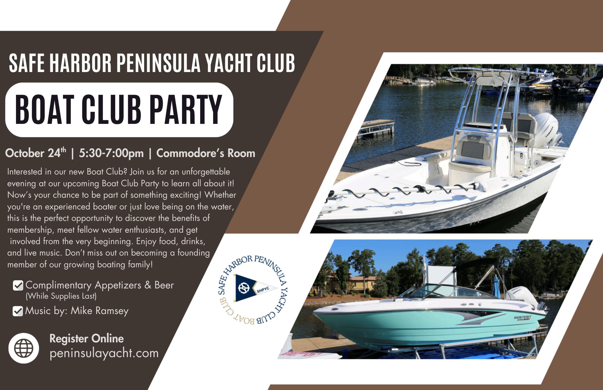 Have your heard about our new Boat Club? Safe Harbor Peninsula Yacht Club has its own Boat Club! We have 6 beautiful boats for those who join. Please see the flyer inside this newsletter to learn more about this exciting new opportunity for our club members. This boat club is only offered to our members