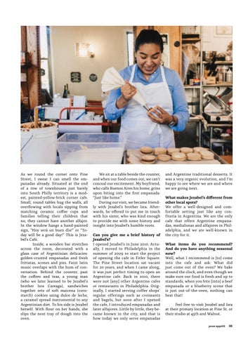 and Argentine traditional desserts. It was a very organic evolution, and I’m happy to see where we are and where we are going next. What makes Jezabel’s different from other local spots? We offer a well-designed and comfortable setting just like any confitería in Argentina. We are the only cafe that offers Argentine empanadas, medialunas and alfajores in Philadelphia, and we are well-known in the city for it. What items do you recommend? And do you have anything seasonal now? Well, what I recommend is [to] come into the cafe and ask: What did just come out of the oven? We bake around the clock, and even though we make sure our food is fresh and up to standards, when you bite [into] a beef empanada or a blueberry scone that is just out-of-the-oven, nothing can beat that! Feel free to visit Jezabel and Isra at their primary location at Pine St. or their studio at 45th and Walnut. penn appétit