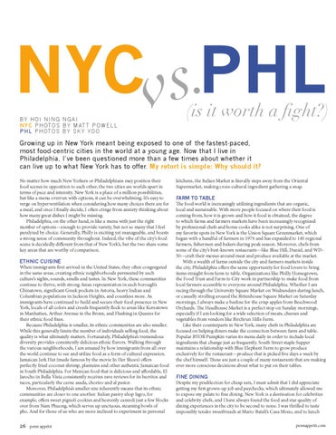 kitchens, the Italian Market is literally steps away from the Oriental Supermarket, making cross-cultural ingredient gathering a snap. Farm to Table The food world is increasingly utilizing ingredients that are organic, local and sustainable. With more people focused on where their food is coming from, how it is grown and how it food is obtained, the degree to which farms and farmers markets have been increasingly recognized by professional chefs and home cooks alike is not surprising. One of my favorite spots in New York is the Union Square Greenmarket, which began with a handful of farmers in 1976 and has expanded to 140 regional farmers, fishermen and bakers during peak season. Moreover, chefs from some of the city’s best-known restaurants—like Blue Hill, Daniel, and WD50—craft their menus around meat and produce available at the market. With a wealth of farms outside the city and farmers markets inside the city, Philadelphia offers the same opportunity for food lovers to bring items straight from farm to table. Organizations like Philly Homegrown, the Food Trust and Farm to City work in partnership to make food from local farmers accessible to everyone around Philadelphia. Whether I am racing through the University Square Market on Wednesdays during lunch, or casually strolling around the Rittenhouse Square Market on Saturday mornings, I always make a beeline for the crisp apples from Beechwood Orchards. The Headhouse Market is a perfect stop on Sunday mornings, especially if I am looking for a wide selection of meats, cheeses and vegetables from vendors like Birchrun Hills Farm. Like their counterparts in New York, many chefs in Philadelphia are focused on helping diners make the connection between farm and table. Popular BYOB Pumpkin varies its menu daily in order to include local ingredients that change just as frequently. South Street staple Supper maintains a relationship with Blue Elephant Farm to grow produce exclusively for the restaurant—produce that is picked five days a week by the chef himself. These are just a couple of many restaurants that are making ever more conscious decisions about what to put on their tables. Fine Dining Despite my predilection for cheap eats, I must admit that I did appreciate getting my first grown-up job and paychecks, which ultimately allowed me to expose my palate to fine dining. New York is a destination for celebrities and celebrity chefs, and I have always found the food and star quality of dining experiences in the city to be second to none. I was thrilled to taste impossibly tender sweetbreads at Mario Batali’s Casa Mono, and to lunch pennappetit.com