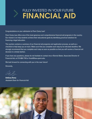 Congratulations on your admission to Penn Carey Law! Penn Carey Law offers one of the most generous and comprehensive financial aid programs in the country. Our mission is to help students achieve their educational goals by identifying practical solutions for financing a legal education. This section contains a summary of our financial aid programs and application process, as well as a checklist to help keep you on track. Make sure that you complete each step by its indicated deadline. We strongly recommend that you complete each step as soon as possible so that you will receive a financial aid decision in a timely fashion. If you have any questions, please do not hesitate to contact me or Bonnie Baber, Associate Director of Financial Aid, at 215-898-7743 or finaid@law.upenn.edu. We look forward to connecting with you in the near future! Sincerely,
